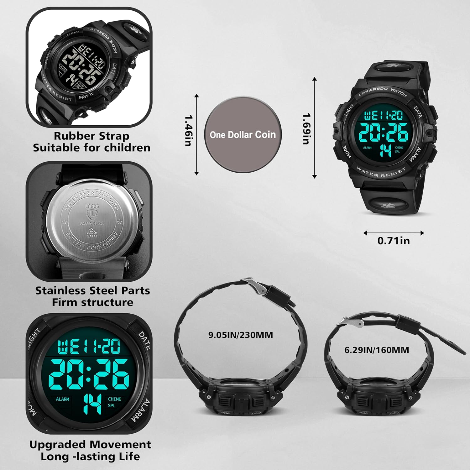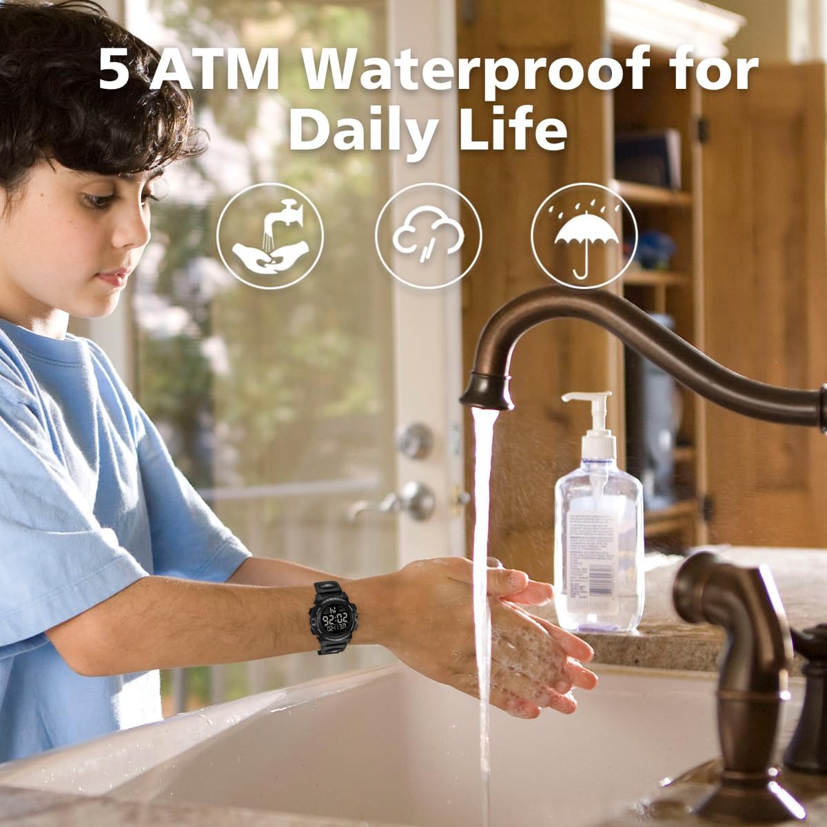 - 50M Waterproof Resistant: It has 50m(5ATM/150FT) waterproof performance, children wearing this waterproof watch can be splashproof and rainproof outdoors or playing, happy and free. Be careful the watches for kids not to operate the buttons in sauna, bathing, or diving.