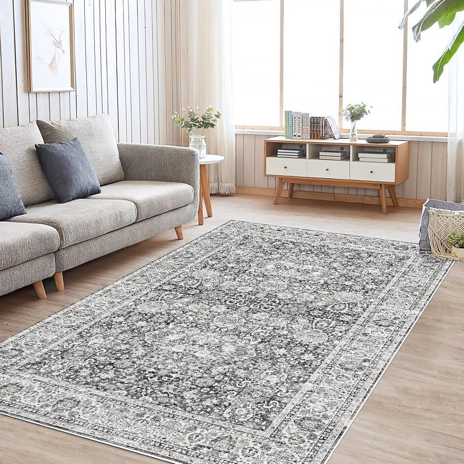 Deerly Grey Rug 6x9 Rugs for Living Room Distressed, Washable Area Rugs Non Slip Large Rug for Bedroom Dining Room Office, Floor Decoration Big Rug Mat Low-Pile(Grey)