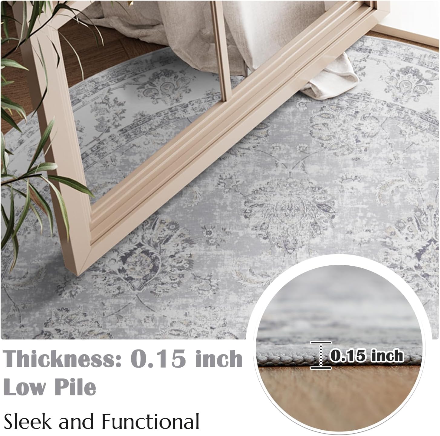 jinchan Round Rug 7ft Area Rugs - Vintage Floral Distressed Design Machine Washable Non-Slip Low-Pile Ultra-Thin Circle Rug for Living Room Dining Room Bedroom Home Office Farmhouse (7' Round,Grey)