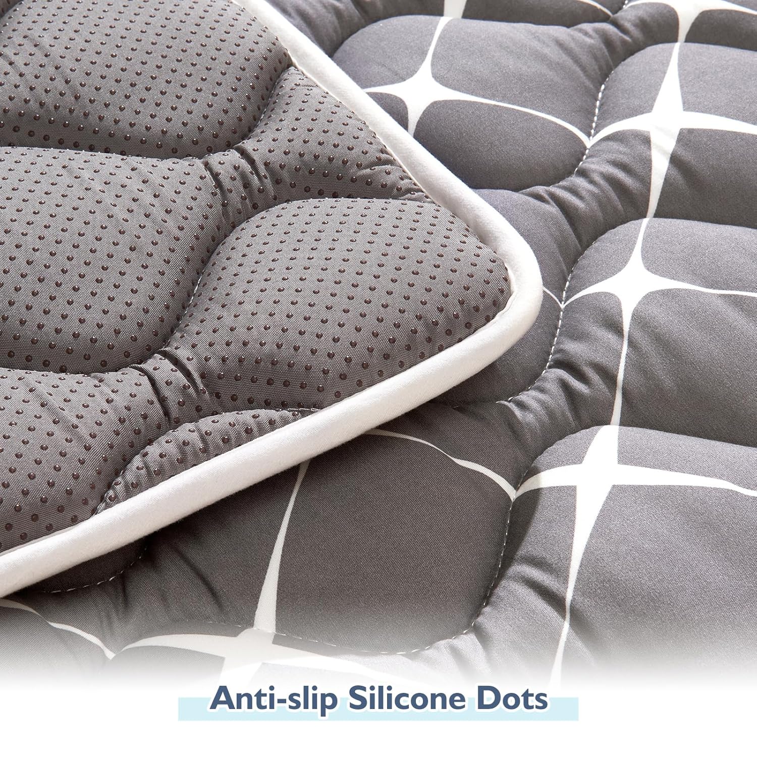 - ăNon-slip, thick and comfortă The back side of the 47x47 play mat for made of anti-slip material, and the bottom backing is silicone dots. It is thicker than other play mat. It prevents babies from causing pain when they fall or bump.