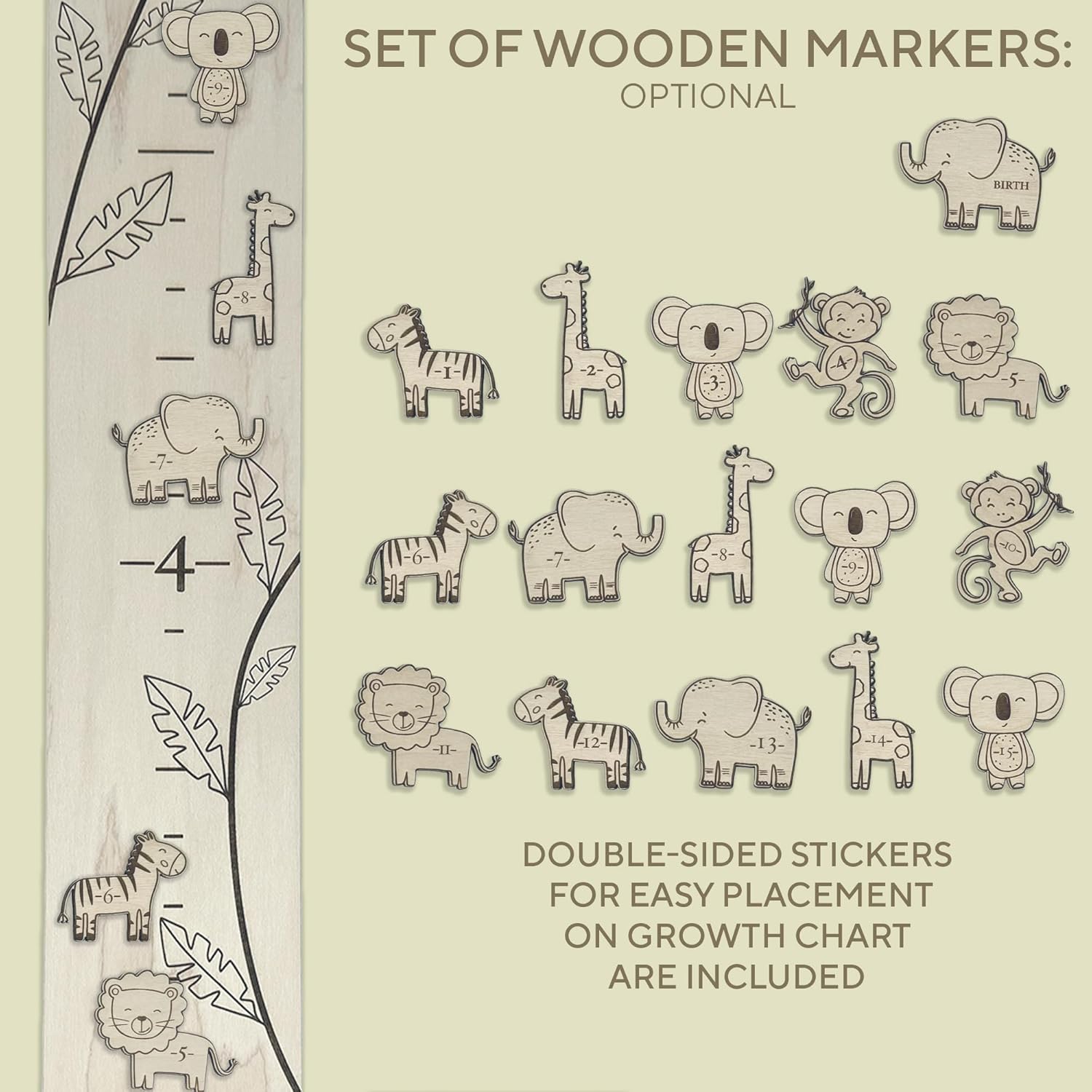 - Optional set of 16 3D wooden markers: presented in various forms, elephants, giraffes, monkeys, lions, koalas, zebras can be attached to wall measurement for kids wood with double-sided tape, to order an extra set of markers, scroll down the product detail page