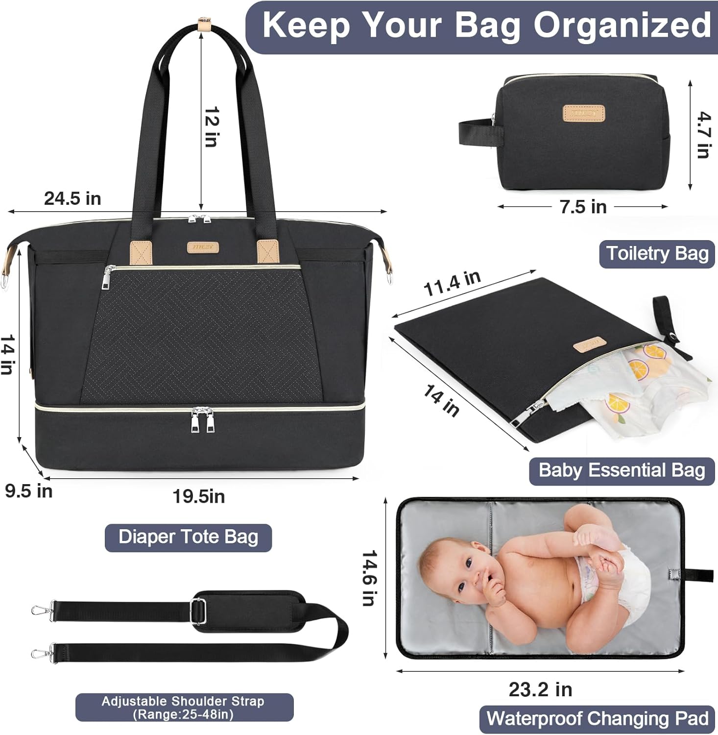 • Convenient Carry on Diaper Bag: Our large diaper bag equipped with an adjustable shoulder strap and thickened support, easily converts from a shoulder bag to a cross-body bag. This diaper bag tote is equipped with 2 baby stroller straps, you can hang the mommy bag on the stroller and free your hands. And a handy luggage sleeve at the back could slide over the carry-on luggage handle easily.The tote bag is a great choice for parents who need a diaper bag for traveling with their baby.