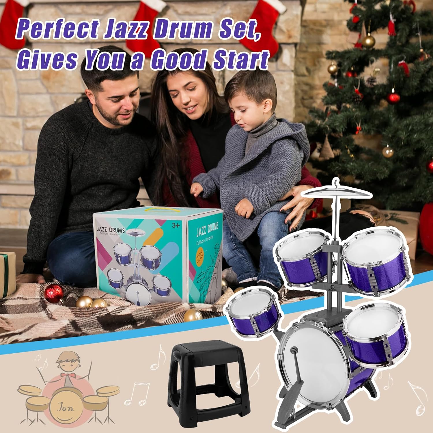 - 【Kids Drum Set with Stool】This jazz drum set is designed for children aged 3-7 years old. It is the perfect size for young drummers and comes with an upgraded comfortable playing stool, you can trust that your child is safe while having fun making music. The stool is sturdy and durable and can also be used as a daily use for children.