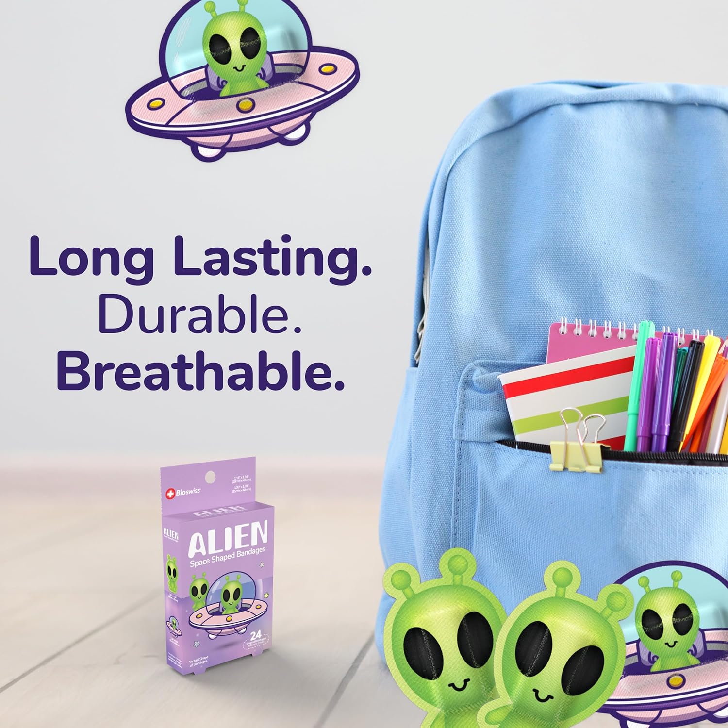 BioSwiss Bandages, Halloween Alien Shaped Self Adhesive Bandage, Latex Free Sterile Wound Care, Fun First Aid Kit Supplies for Kids, 24 Count
