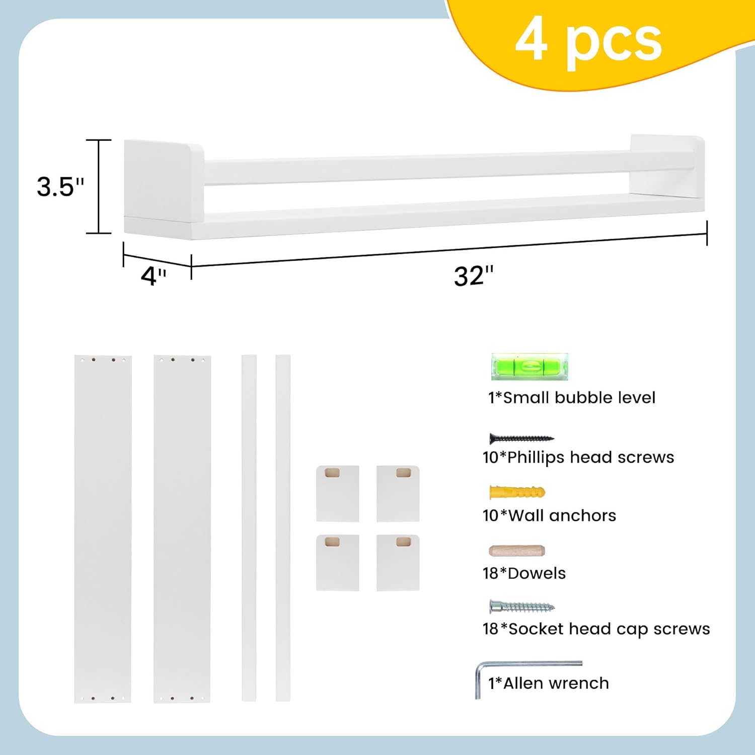 Fun Memories Nursery Book Shelves - Rustic Natural Solid Wood Floating Bookshelf for Kids - Wall Book Shelves for Kids Room (White, 32inch - 4P)