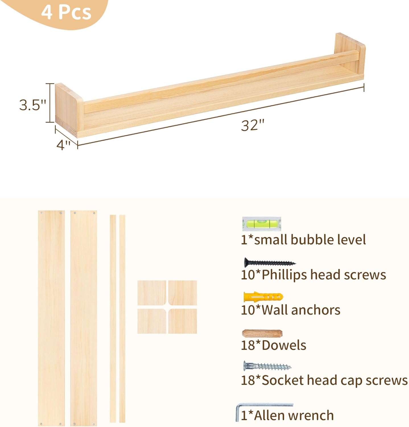 Fun Memories Nursery Book Shelves - Rustic Natural Solid Wood Floating Bookshelf for Kids - Wall Book Shelves for Kids Room (Natural, 32inch - 4P)