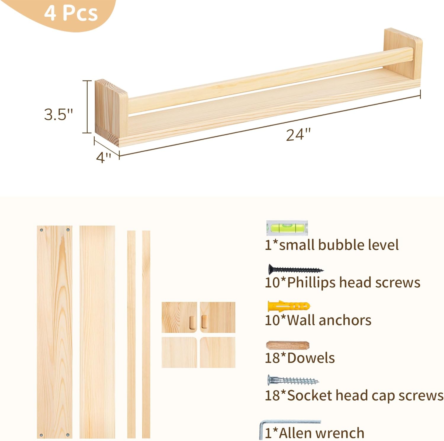 Fun Memories Nursery Book Shelves - Rustic Natural Solid Wood Floating Bookshelf for Kids - Wall Book Shelves for Kids Room (Natural, 24inch - 4P)