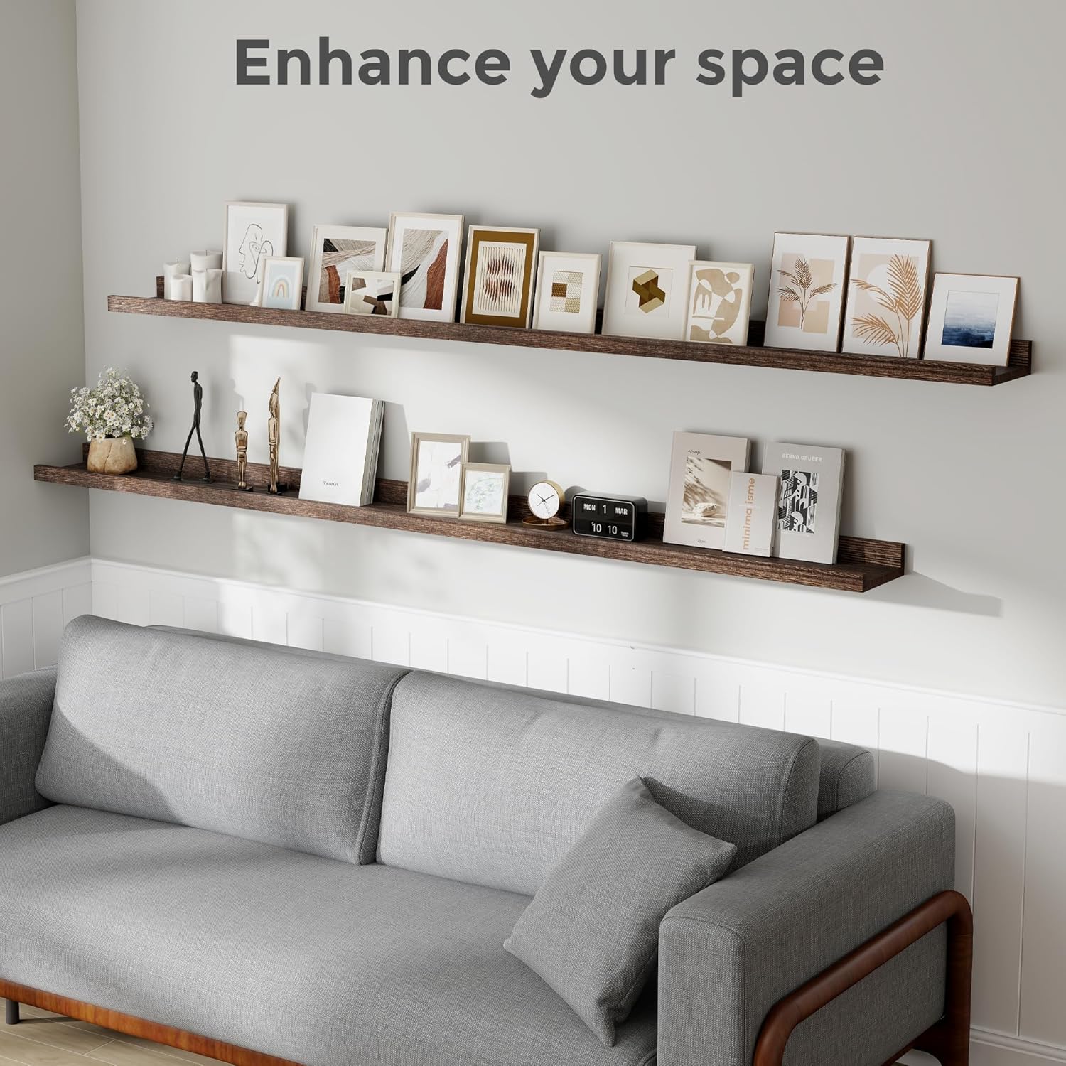- ăSolid Wood Nursery ShelvesăThe wall shelves are crafted from Paulownia wood which are lightweight yet proportionately strong, sustainable real wood. The picture ledge wall shelf is SAME SIZE as each other (L 72" x D 5.12" x H 2.2") and is such an easy way to display photos without making lots of holes in your walls. They come fully assembled and all mounting hardware is included in the package.