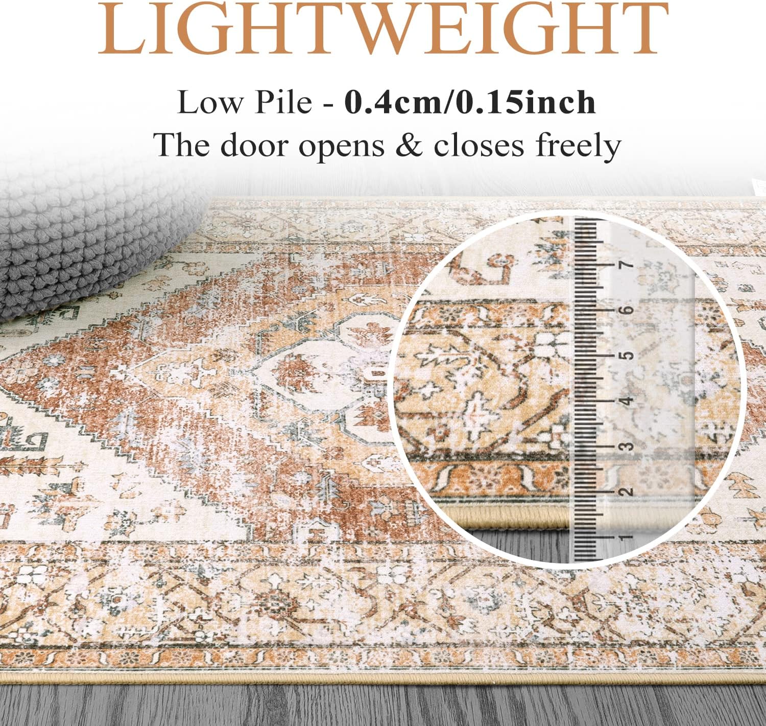 - Functional Lightweight Rug - Lahome ultra-thin rugs are made with everyday use in mind and high-traffic areas. 0.15 inches thickness allows for convenient placement in hallway, kitchen, entryway and underneath furniture. The door opens and closes freely
