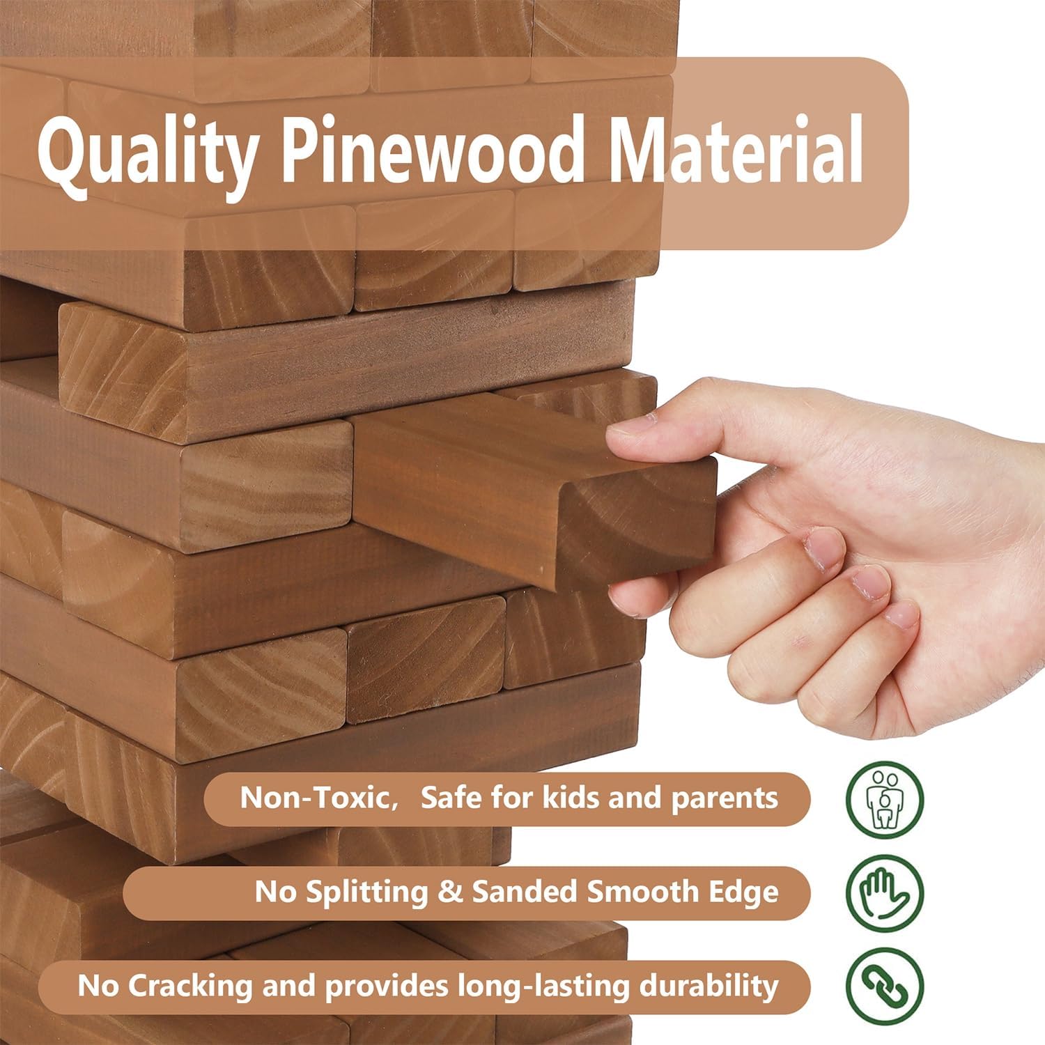 - Giant Size Timber Game Set: Juegoal large size brown color giant tumble tower set comes with 54 pieces wooden tumble blocks, 1 pcs game board with pen and a zipper bag. Each block is 6.9 x 2.3 x 1.2 inch, 2FT (18 rows) could be grown up to 4FT tall tower when played. A great fun, fast-paced stacking game and indoor or outdoor playing game for all ages