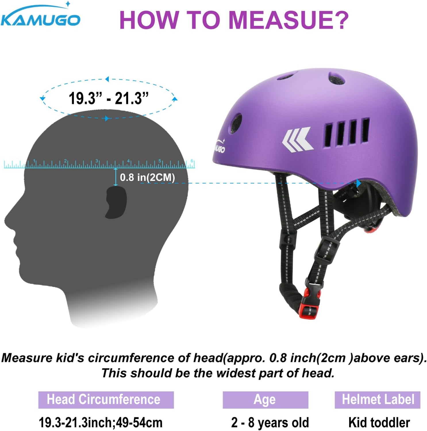 - PREMIUM SAFETY: KAMUGO kids helmets set are specially designed for kids head protection, complies with US CPSC Safety Standards,Child helmets are made with tough and durable Polycarbonate shell and high quality Expanded Polystyrene foam integrated molding,Toddler helmet have reflective markings on both sides and back, making exercise safer for children.