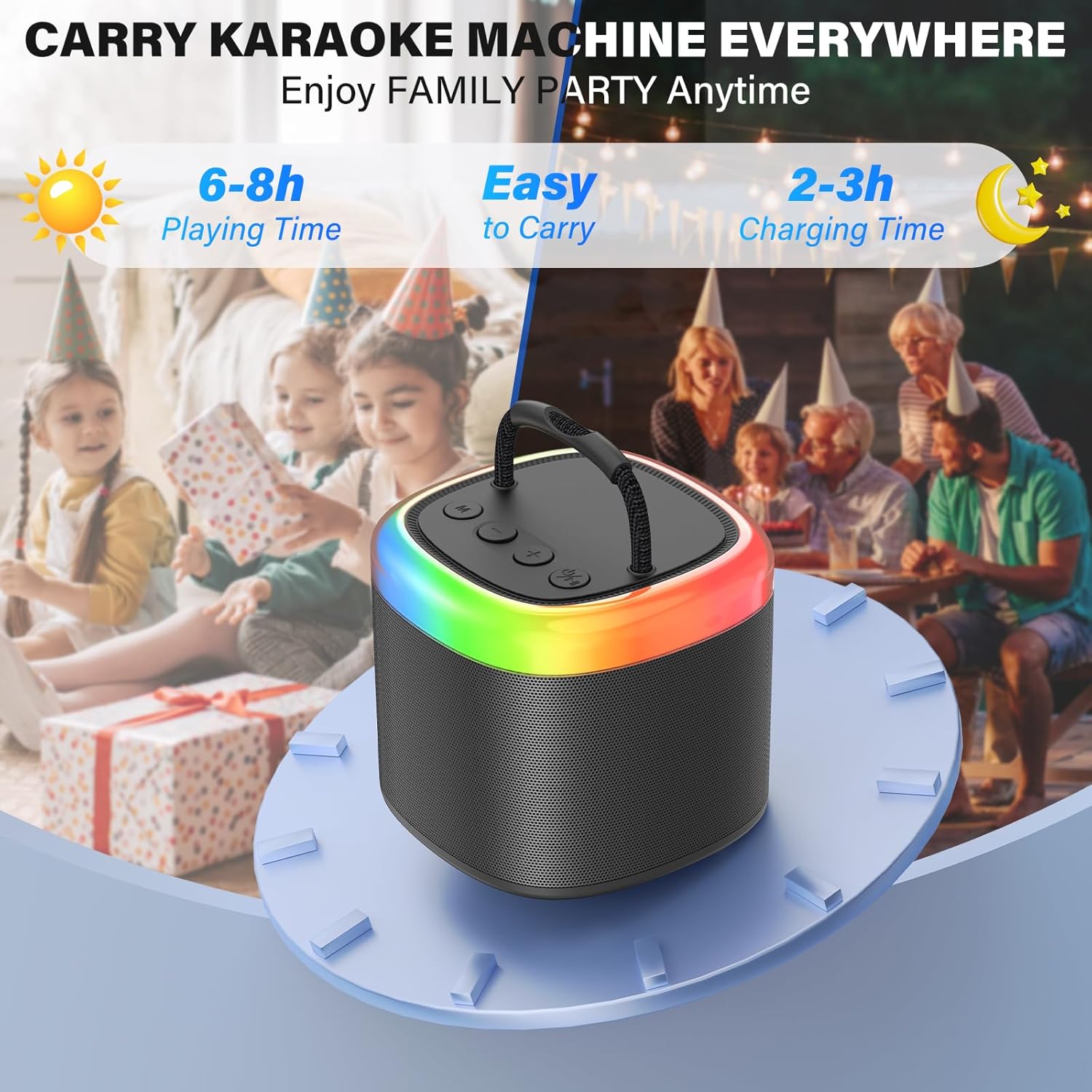 - ♪【Long Playback Time】Enjoy up to 6-8 hours of playtime with our built-in rechargeable battery. Quick to charge and durable, it's ideal for outdoor events, family gatherings, birthdays, conferences, and classes, ensuring the party travels with you.