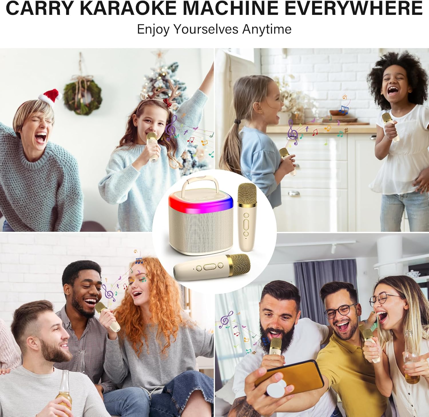 JYX Mini Karaoke Machine for Kids, Portable Bluetooth Karaoke Speaker Unpowered Cabinets with 2 Wireless Microphones and Party Lights for Adults, Birthday Gifts for Girls Boys Family Home Party(Beige)