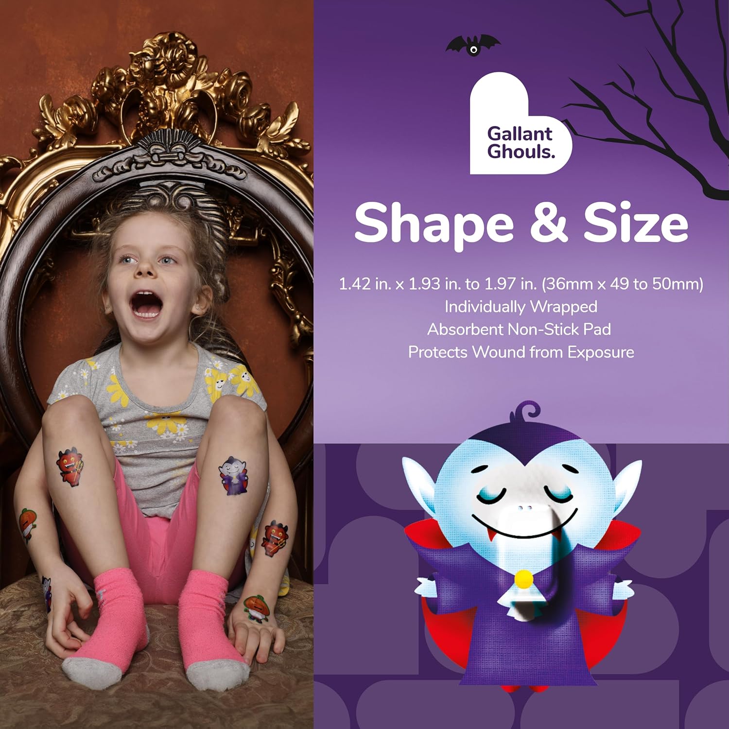 - GHOUL HALLOWEEN BANDAGES: This 50 piece pack of frightfully fun Halloween Ghoul bandages features Felix the Devil, Draco the Pumpkin, and Darthula the Vampire shapes, and is great for putting a smile on kids' faces while protecting wounds such as cuts, scrapes, and burns; sticky bandages come in a cute plastic container and are perfect for kids and adults alike, and also for school nurses and pediatric doctors
