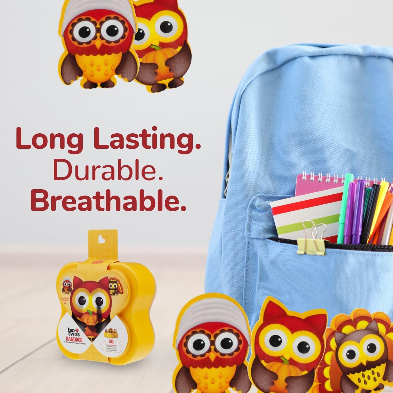 - THANKSGIVING BANDAGES: This 50 piece pack of Thanksgiving owl bandages feature fun Hope, Autumn, and Faith owl shapes, and is great for putting a smile on kids' faces while protecting wounds such as cuts, scrapes, and burns; sticky bandages come in a cute plastic container and are perfect for kids and adults alike, and also for school nurses and pediatric doctors