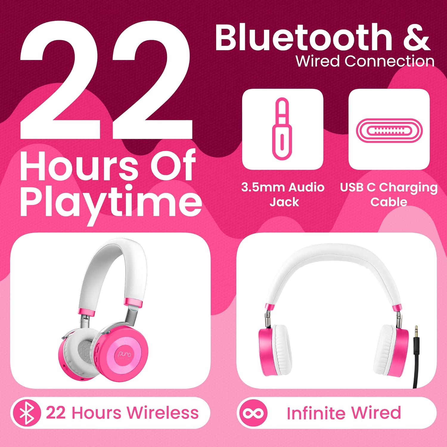 Puro Sound Labs JuniorJam Plus Volume-Limiting Wireless Bluetooth Headphones for Kids, Secure Audio with Adjustable On-Ear Design, 22-Hour Battery, Ideal for Tablets, Smartphones & PCs - Pink