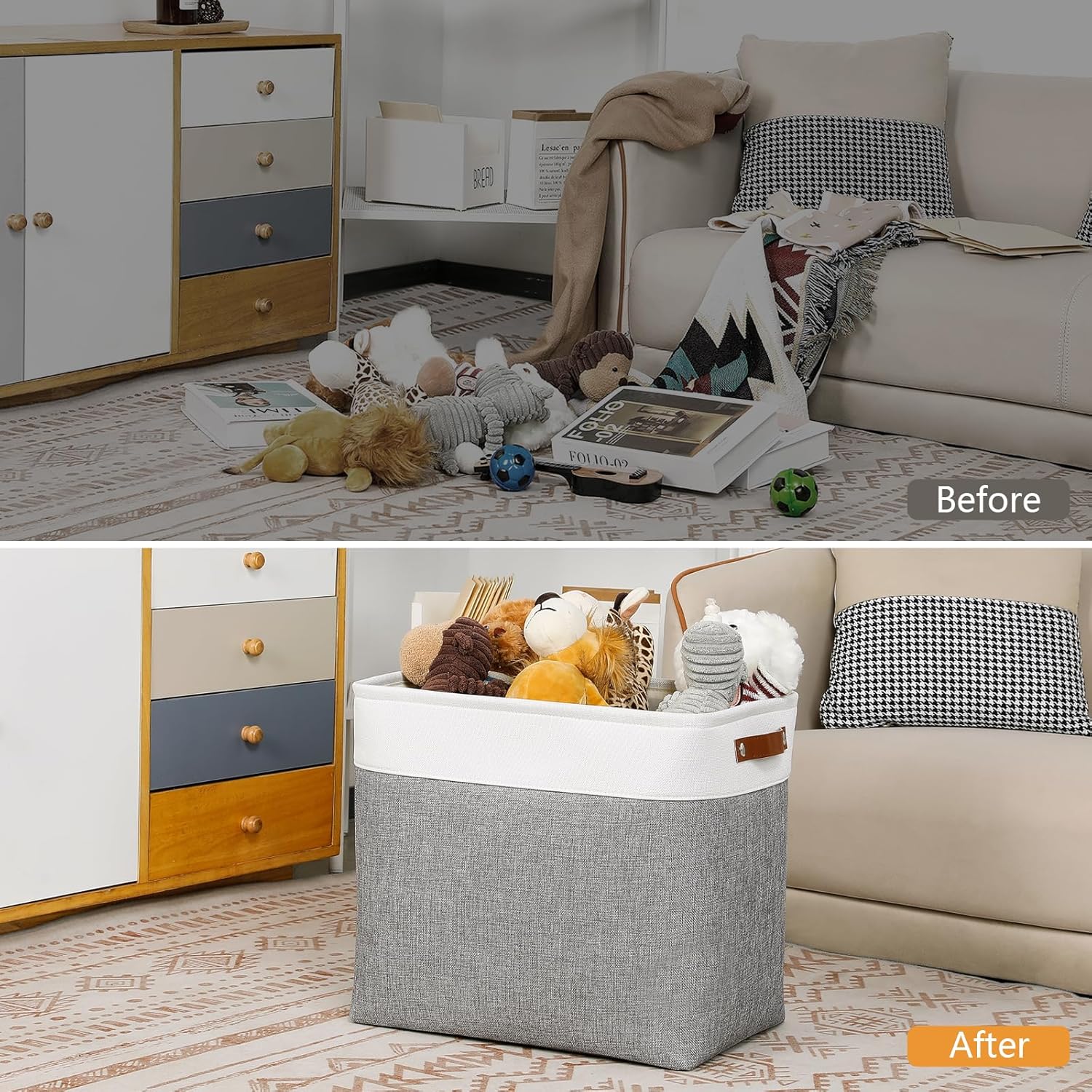 - 【Unique Design & Modern & Decorative】Set of 3 large storage baskets, dimensions(each): 17(L) x 12(W) x 15(H) inches. Collapsible storage baskets bring you organizing convenience and a sweet home. Great for socks, underwear, books, magazines, toys, baby clothes, pet products, wipes, towels, decorations, office supplies, DVDs, and gifts. The fabric baskets with neutral colors can match a lot of home styles - keeping your home nice and tidy.