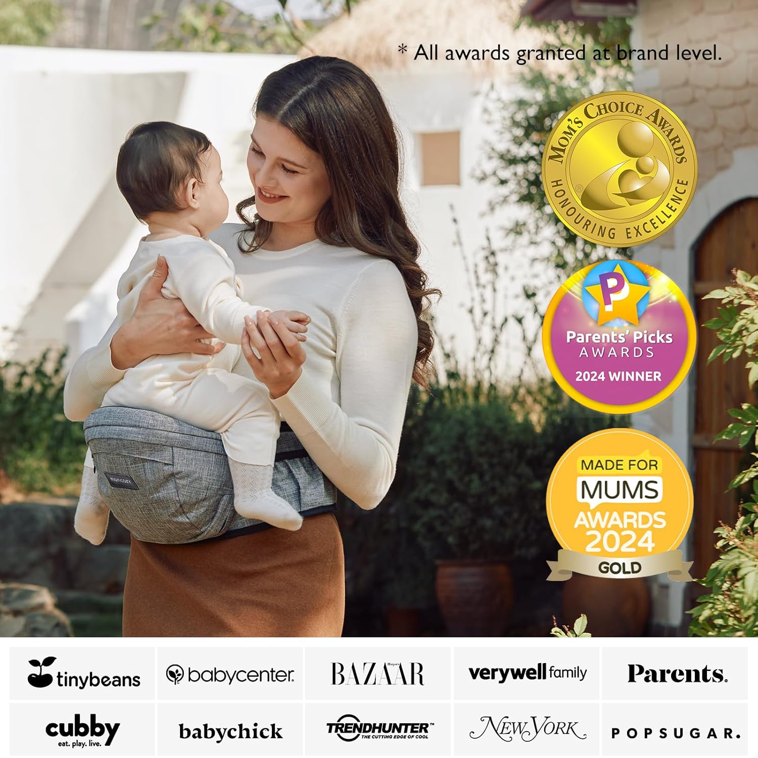 Momcozy Hip Seat Baby Carrier - Adjustable Waistband with Original 3D Belly Protector, Ergonomic Carrier with Various Pockets for Toddlers up to 45lbs (Grey, Medium 27-45IN)