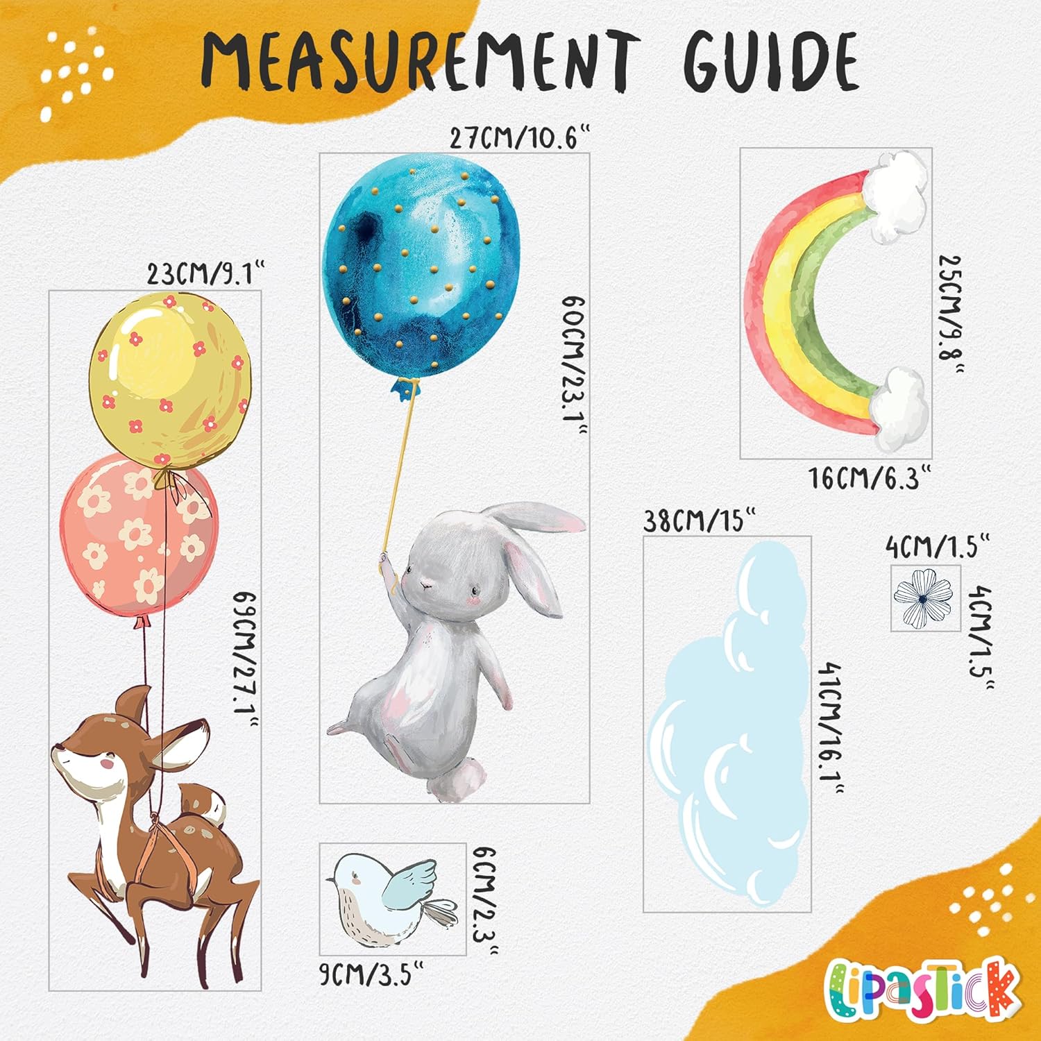 - π Package Content: Animal wall decals for baby room come in a pack of 3 sheets. Includes: hot air balloons, panda, bunnies, raccoon, koala, fox, birds, clouds, and butterflies. The sheet size is 47.2" x 16.7". This set of stickers is size XXL and its finished size is 156.2" x 48β. Perfect for covering full wall.