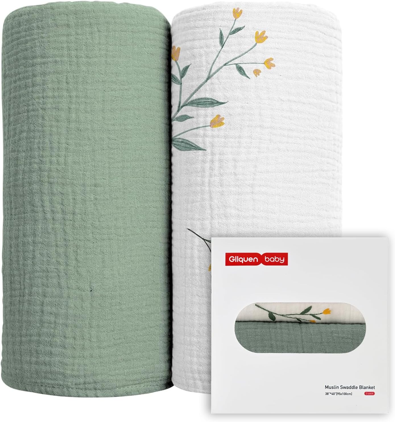GLLQUEN BABY 2-Pack Muslin Swaddle Blankets for Unisex, Baby Swaddle Blanket for Boys and Girls, Soft Breathable Receiving Blankets Neutral, Newborn Essentials, Registry & Gift, 40 x 38 inches