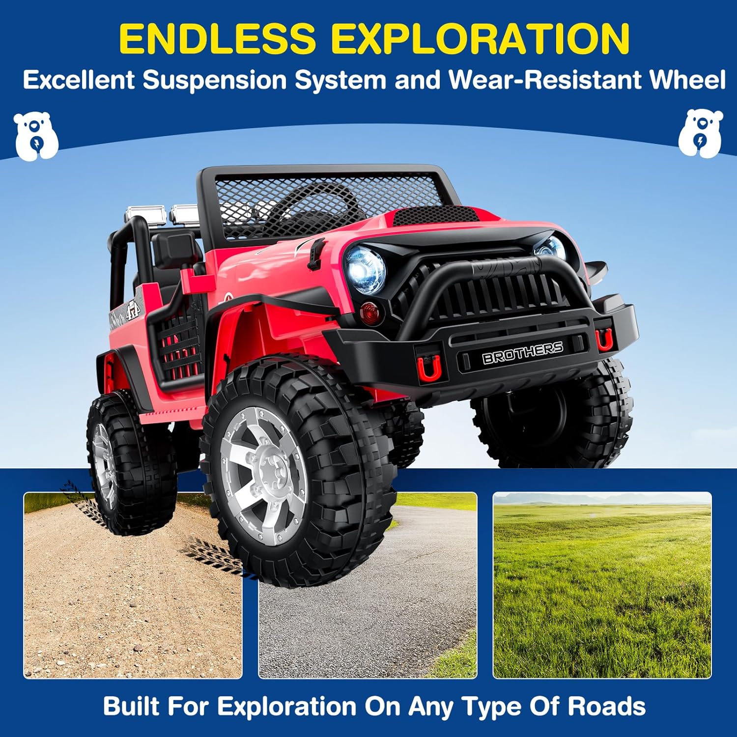 - UNLEASH THE THRILL!: Powered by a 12V 7Ah battery, it offers up to 40 minutes of ride time. With 4 spring suspensions and rugged tires, it conquers any terrain. 3-speed modes, maxing at 4.97mph, provide an exhilarating experience for kids. Get ready for endless fun!
