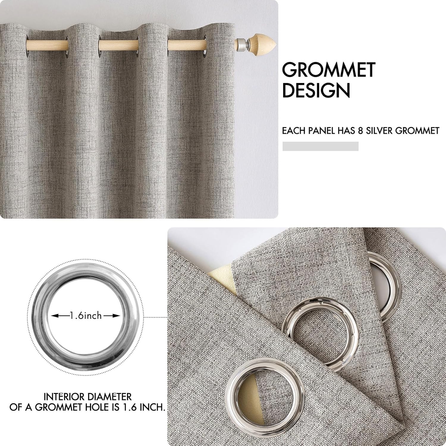 - SIZE & MATERIAL:Set includes 2 panels blackout curtains(52" Wide by 45" Long). Each panel has 8 grommets.The interior diameter of hole is 1.6 inch.It's easy to hang. Curtains are made by quality faux linen.