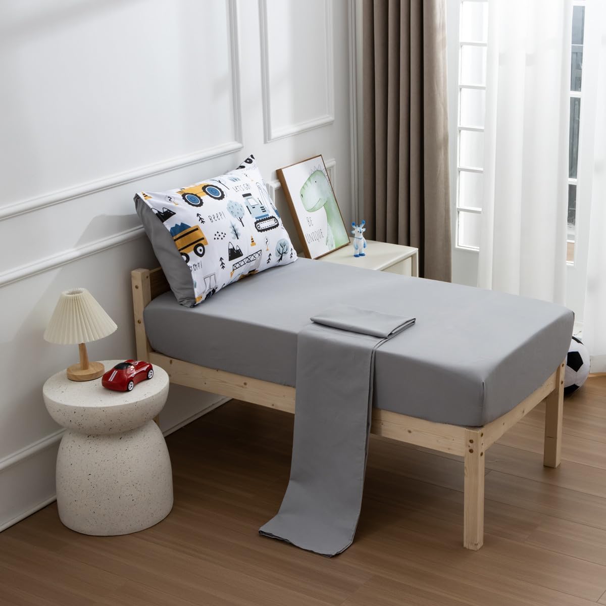 - 【Package Contents】4-Piece Toddler Bedding Set includes: 1 reversible comforter (42" x 57"), 1 reversible pillowcase (20" x 30"), 1 flat top sheet (45" x 60") and 1 fitted bottom sheet (28" x 52" x 8").