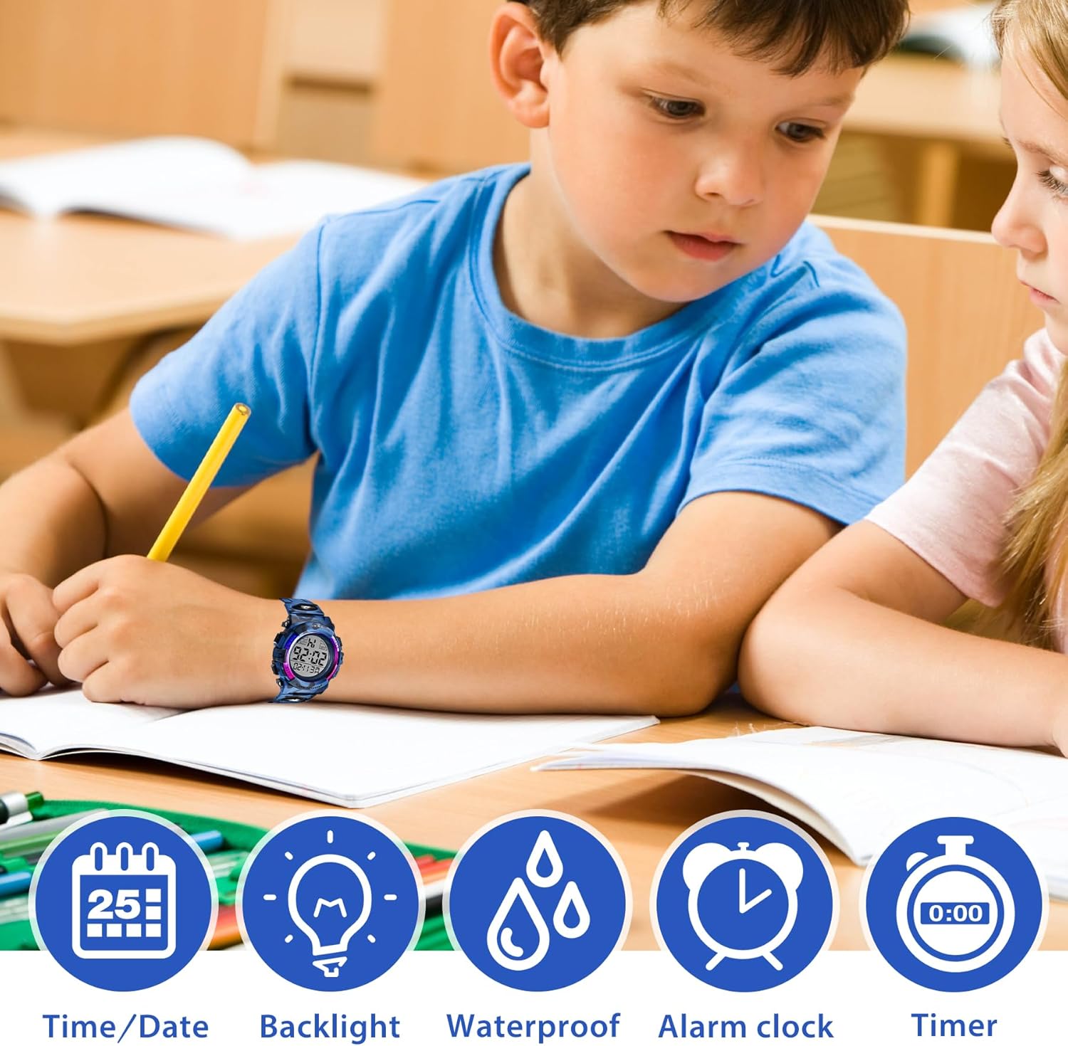 - 50M Waterproof Resistant: It has 50m(5ATM/150FT) waterproof performance, children wearing this waterproof watch can be splashproof and rainproof outdoors or playing, happy and free. Be careful the watches for kids not to operate the buttons in sauna, bathing, or diving.