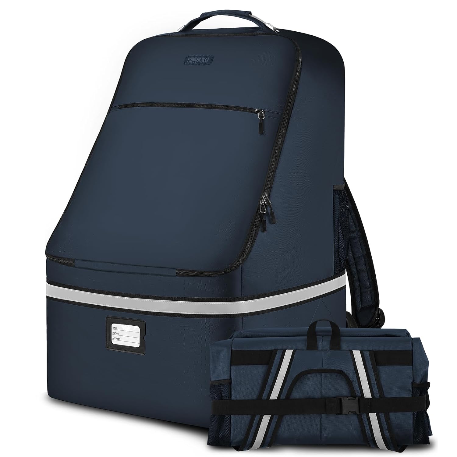 - Comfortable: A rugged handle with steel cable on the top is easy for you to carry with a hand.In addition, there are reflective strips on the strap, which is convenient for you to travel at night. Padded interior wings and internal fixing strap hold infant car seat in its place.Padded backpack straps and waist strap are adjustable, providing a comfortable, carrying option for parents. Ergonomic infant car seat travel bag for airplane