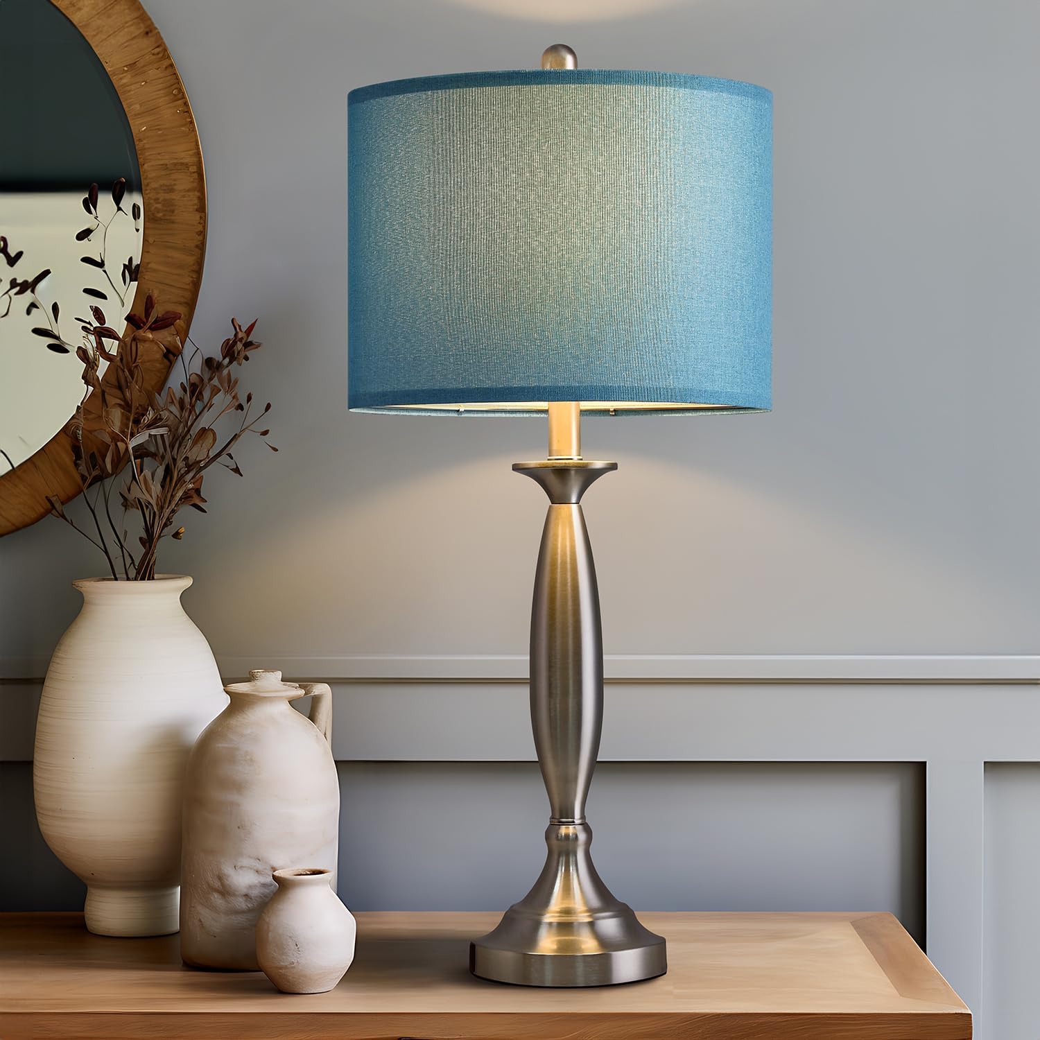 - Minimalist &Modern Design: The set of 2 bedside lamps are constructed of high-quality silver metal base and linen fabric lamp shades that provide a modern feeling aesthetic. Table lamp for living room is perfect in living room bedrooms, bedside, café, corridors, restaurants, etc. It displays a warm and beautiful atmosphere to a room.(Note: The shade needs to be assembled)