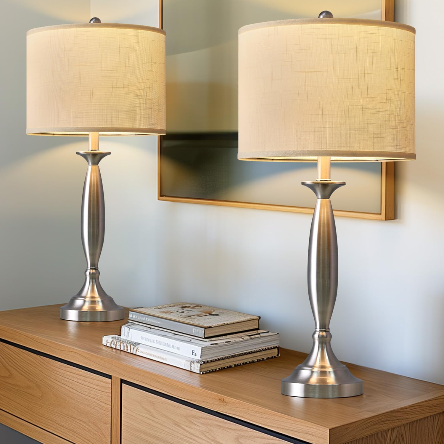 - Minimalist &Modern Design: The set of 2 bedside lamps are constructed of high-quality silver metal base and linen fabric lamp shades that provide a modern feeling aesthetic. Table lamp for living room is perfect in living room bedrooms, bedside, café, corridors, restaurants, etc. It displays a warm and beautiful atmosphere to a room.(Note: The shade needs to be assembled)