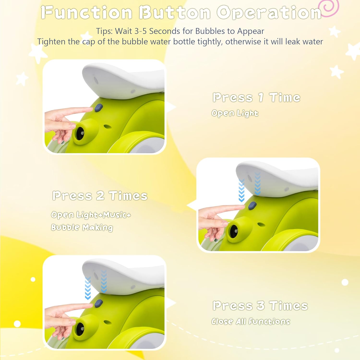 - Exciting Features for The Bubble Bike:The thoughtful design includes bubble devices, light effects, music functions, and whistles, adding more fun to the driving experience. Parents can ensure safe driving directions using the remote control. The use of plastic material instead of metal makes the ride-on toy lighter, more compact, and easy to store and carry. The non-slip, wear-resistant wheels are gentle on floors and allow the baby to ride indoors or outdoors.
