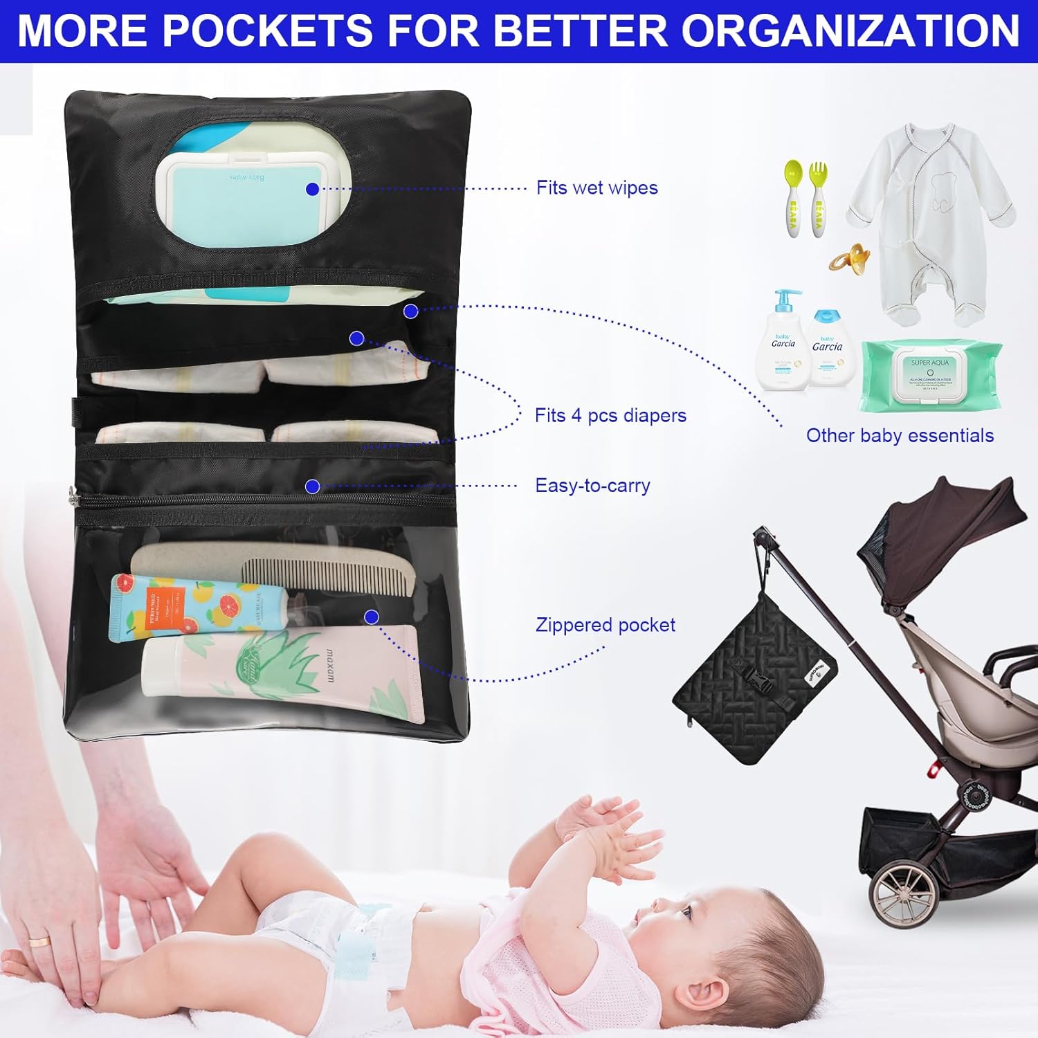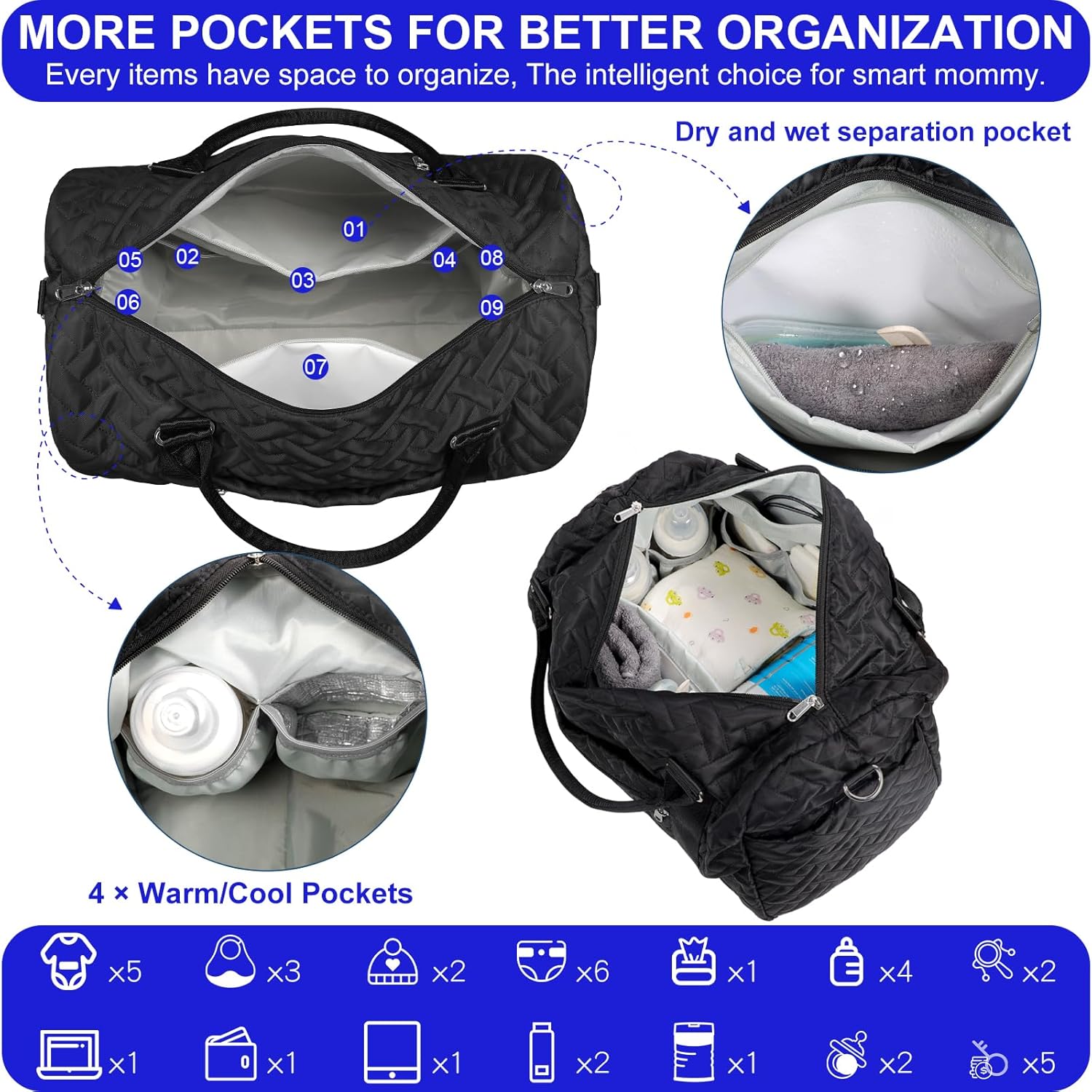 - MULTI POCKET MOMMY BAG:Mommy bag has 15 pockets and a diaper changing bag. Insulated bottle bag 4, dry and wet separation bag 1, privacy bag 1, flat bag 3. The main warehouse with large opening mainly stores diapers, paper towels, milk powder, clothes, shoes and hats and other daily necessities. External pockets can store emergency items without having to search the main bag. Travel companion, modern style mommy bag, personalized design of travel diaper bag