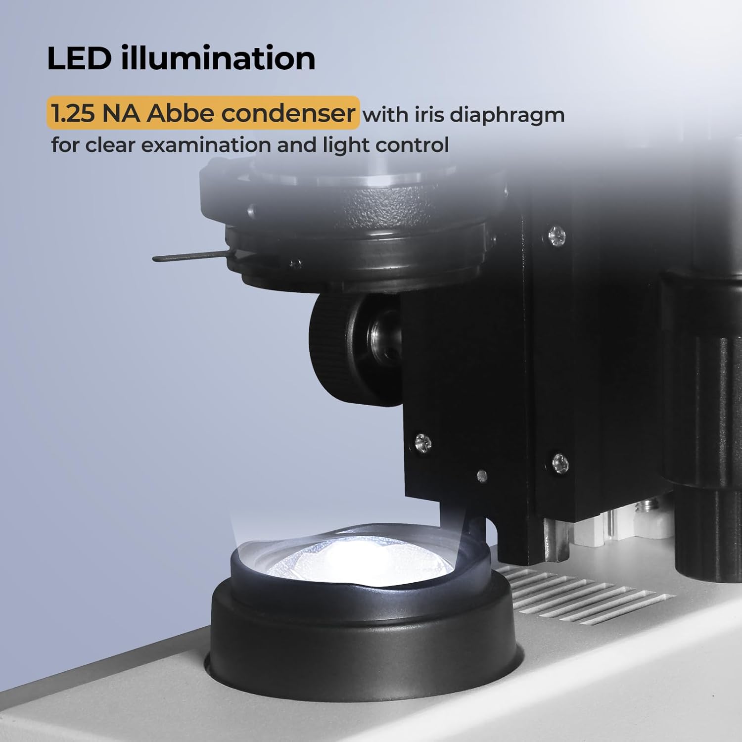 - [LED illumination & Condenser]: LED illumination, and 1.25 NA Abbe condenser with iris diaphragm for clear examination and light control.