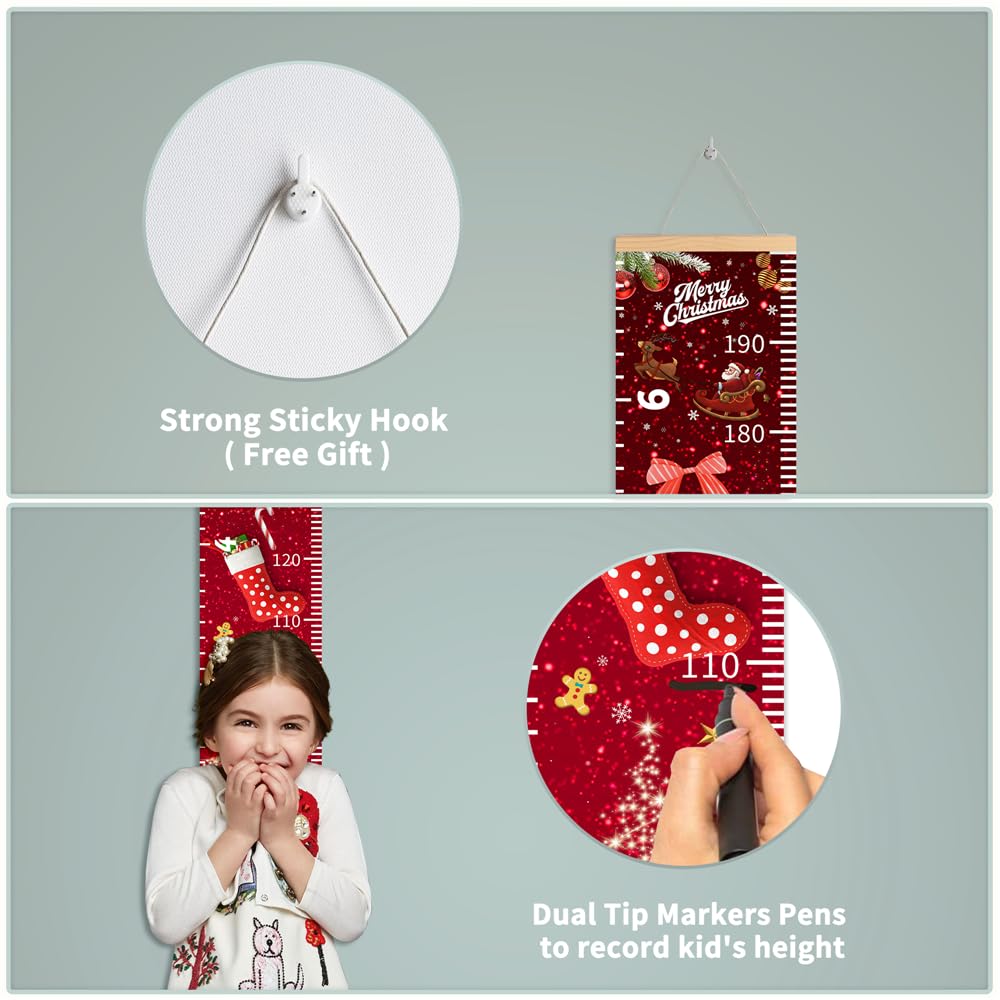 - CHRISTMAS GROWTH CHART SIZE & MATERIAL - 77"x7.9"/195 cm x20 cm(L x W). The Xmas wall hanging ruler can be actually measured up to 79 inches (200 cm). Made of hanging rope, wood pieces and cotton canvas, waterproof, durable. Add the kids name and make the growth chart special!
