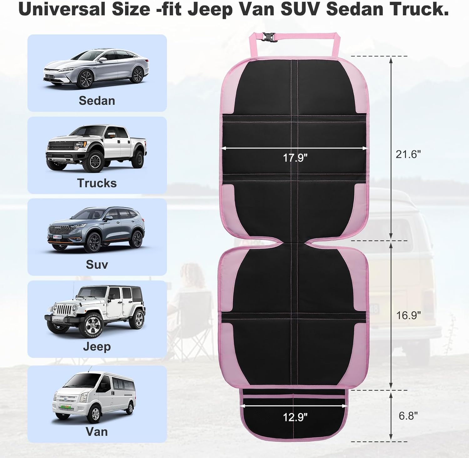 Child Car Seat Protector, 2 Pack with Mesh Pockets & Non-Slip Backing, 600D Durable (Pink, Standard)