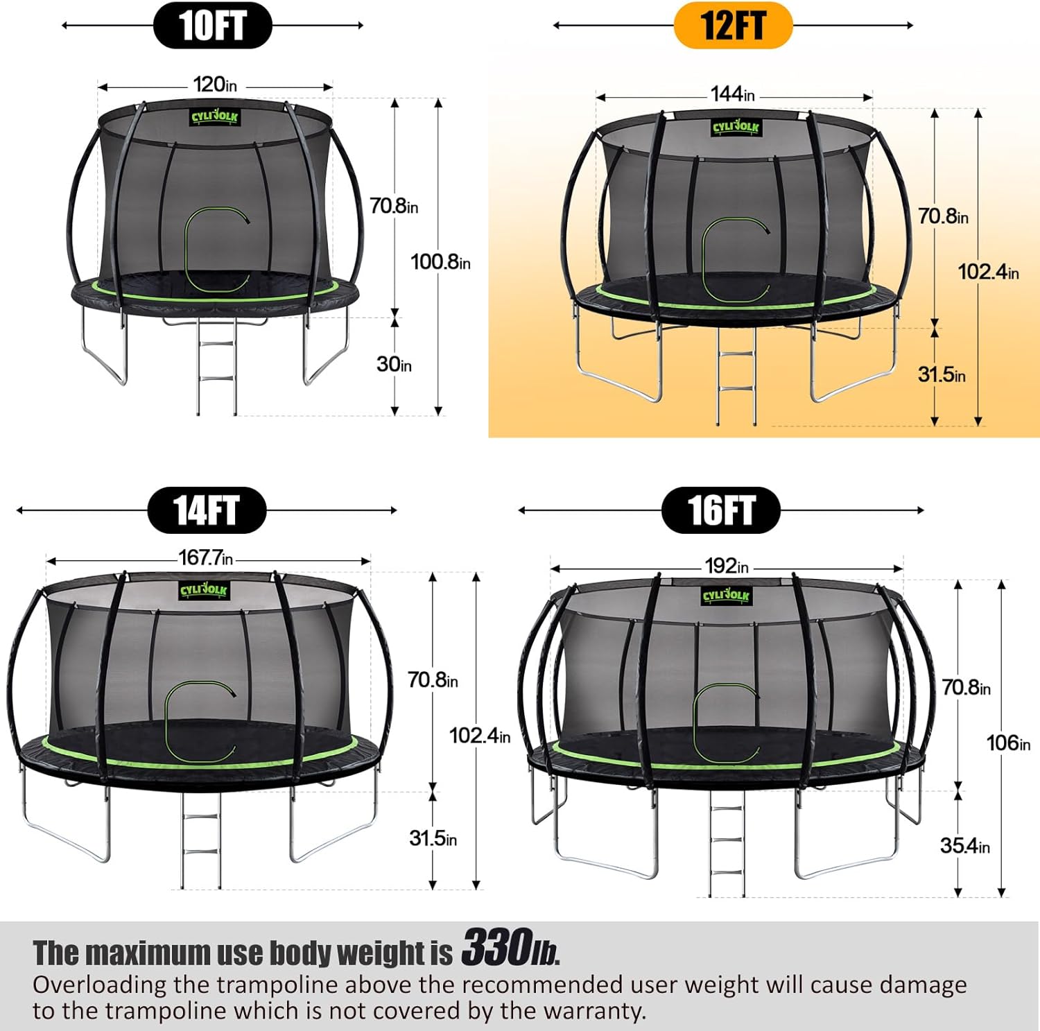 - Easy Assembly: All components of the 12 foot backyard recreational trampoline are packed in one box. 12 ft outdoor trampoline with enclosure net comes with easy-to-follow instructions and tools. Weight capacity: 330 lbs