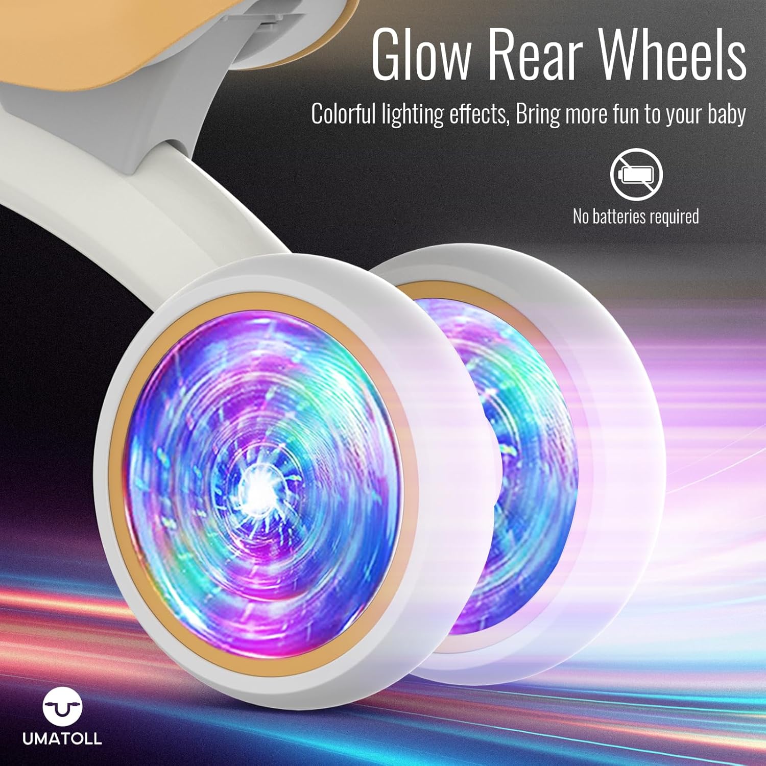 - GLOW REAR WHEEL: Colorful lighted rear wheels are more eye-catching to make babies more interested, inspires their curiosity. Bring more fun to your baby. No batteries required, just spin the wheels to glow.