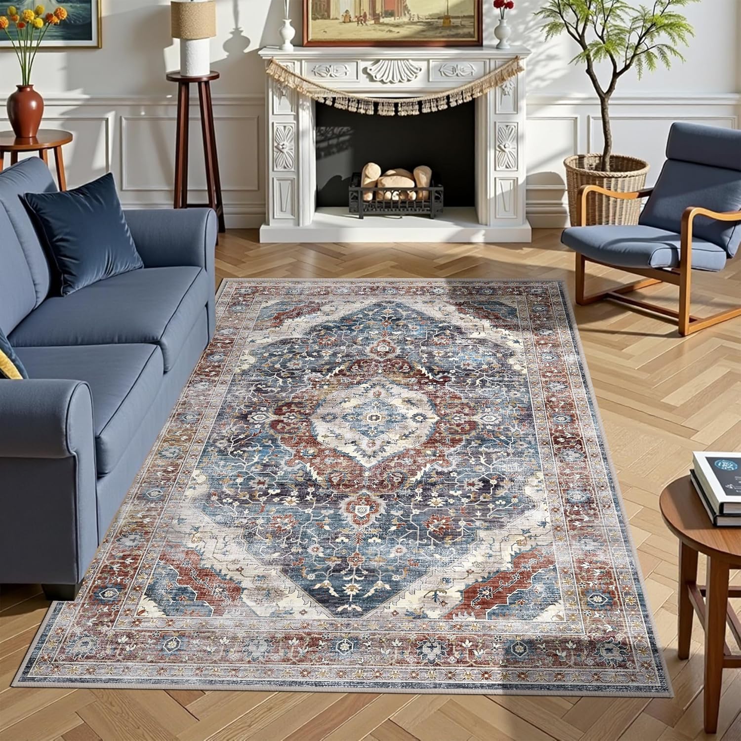 Rugs 5x7 Washable Rug, Non Slip Large Rug for Living Room Bedroom Dining Room, Low-Pile Kid & Pet Friendly Distressed 5x7 Carpet Print Floor (Border Brown/Navy Blue)