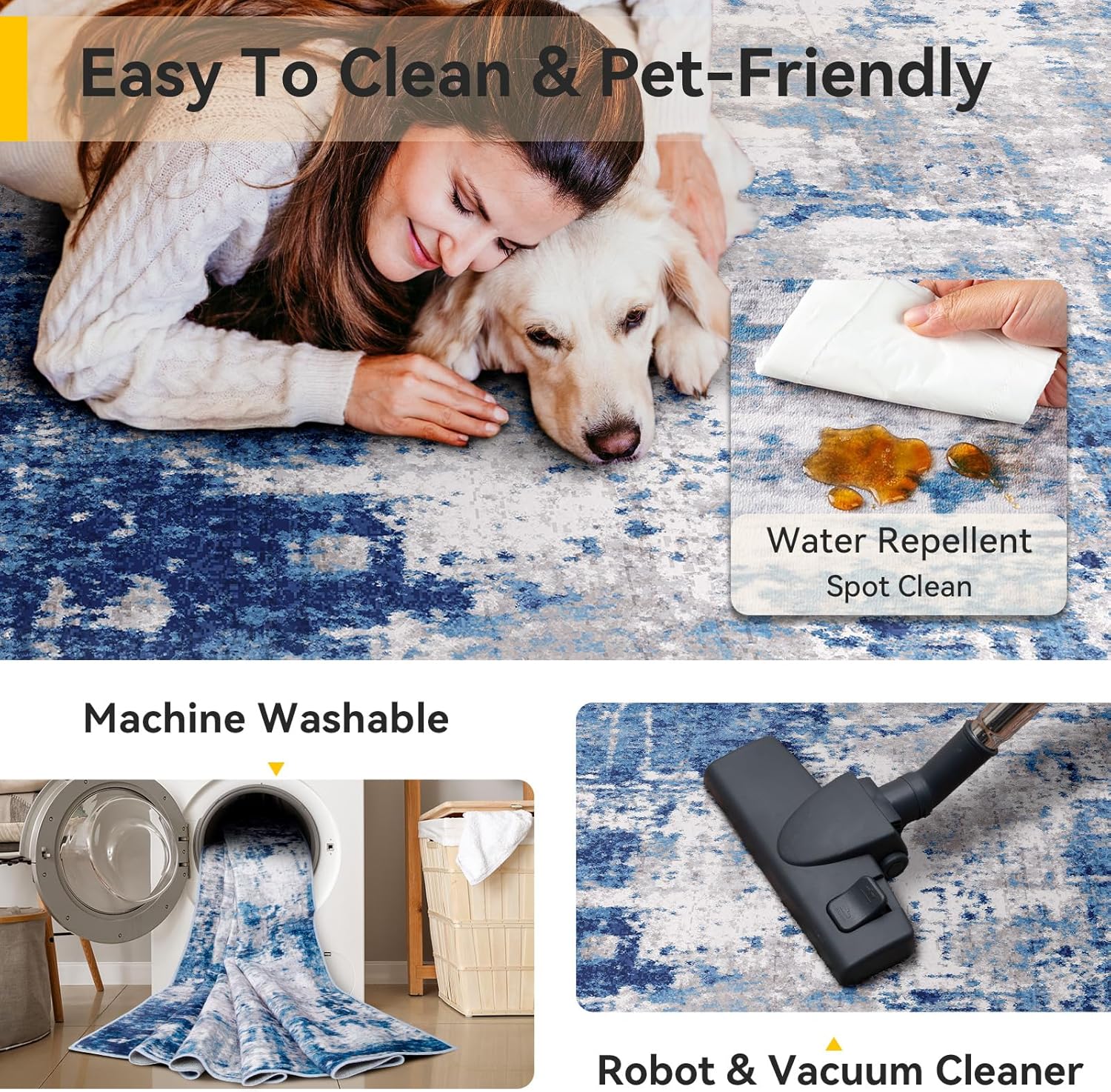 - Tides Series โ Effortless style that flows with your life.This modern machine-washable non-slip rug features reinforced edges and a low-pile design that resists dirt. Its water-repellent surface makes spills easy to clean - liquids bead up for quick wiping. Simply machine wash in cold water (no bleach) to refresh. The non-slip backing keeps it securely in place. A perfect blend of function and contemporary design for active homes.