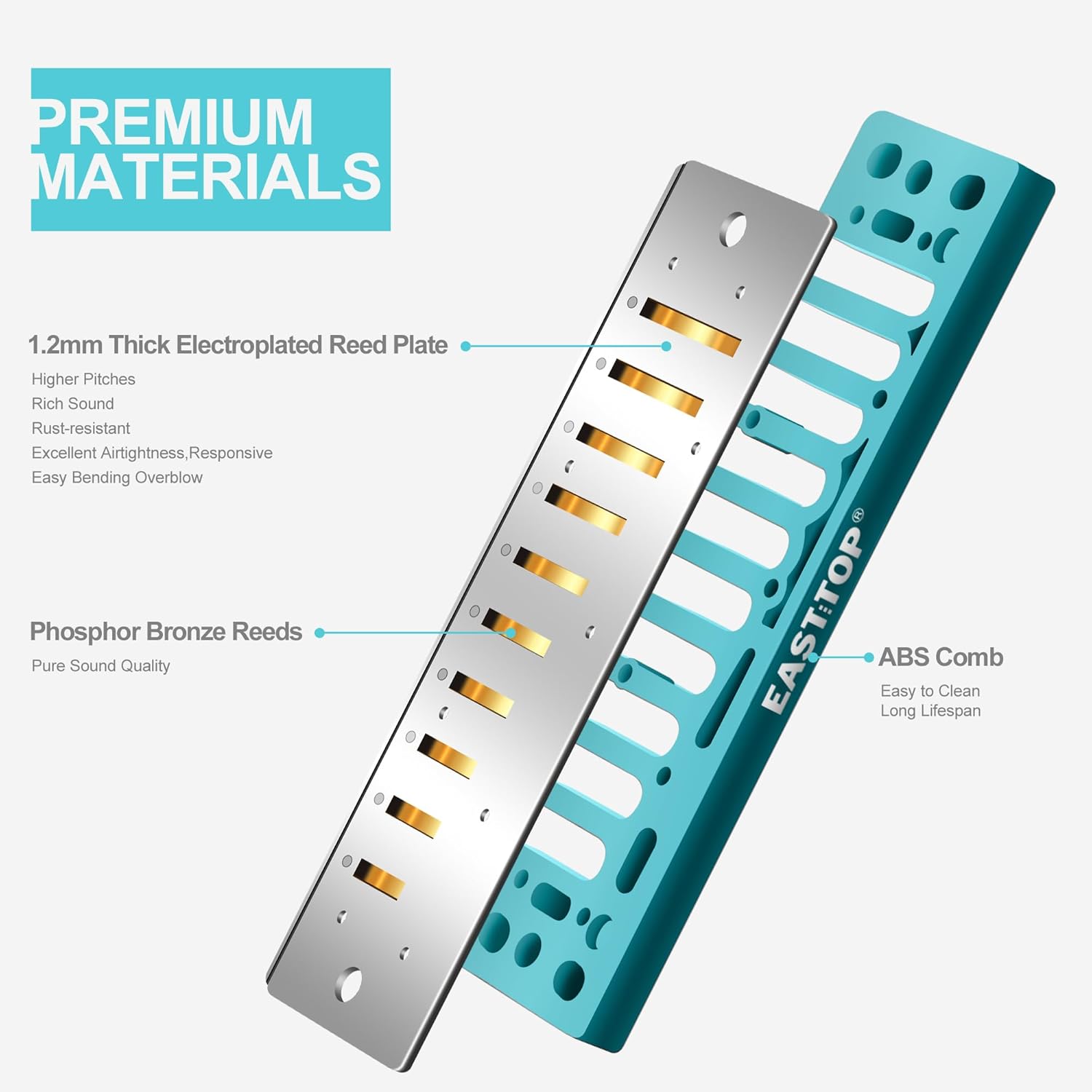 - Package includes 1x harmonica (key of Ab); 1x instruction and 1x cleaning cloth. This harmonica is an upgraded version of the T008K, which uses a more complex spot welding technique in the gong soldering process. Therefore, this harmonica can play more beautiful songs.We are the harmonica manufacturer of the East top brand. Backed Up with East top 30 Days Unconditional Money Back. You can rest assured to buy our products.