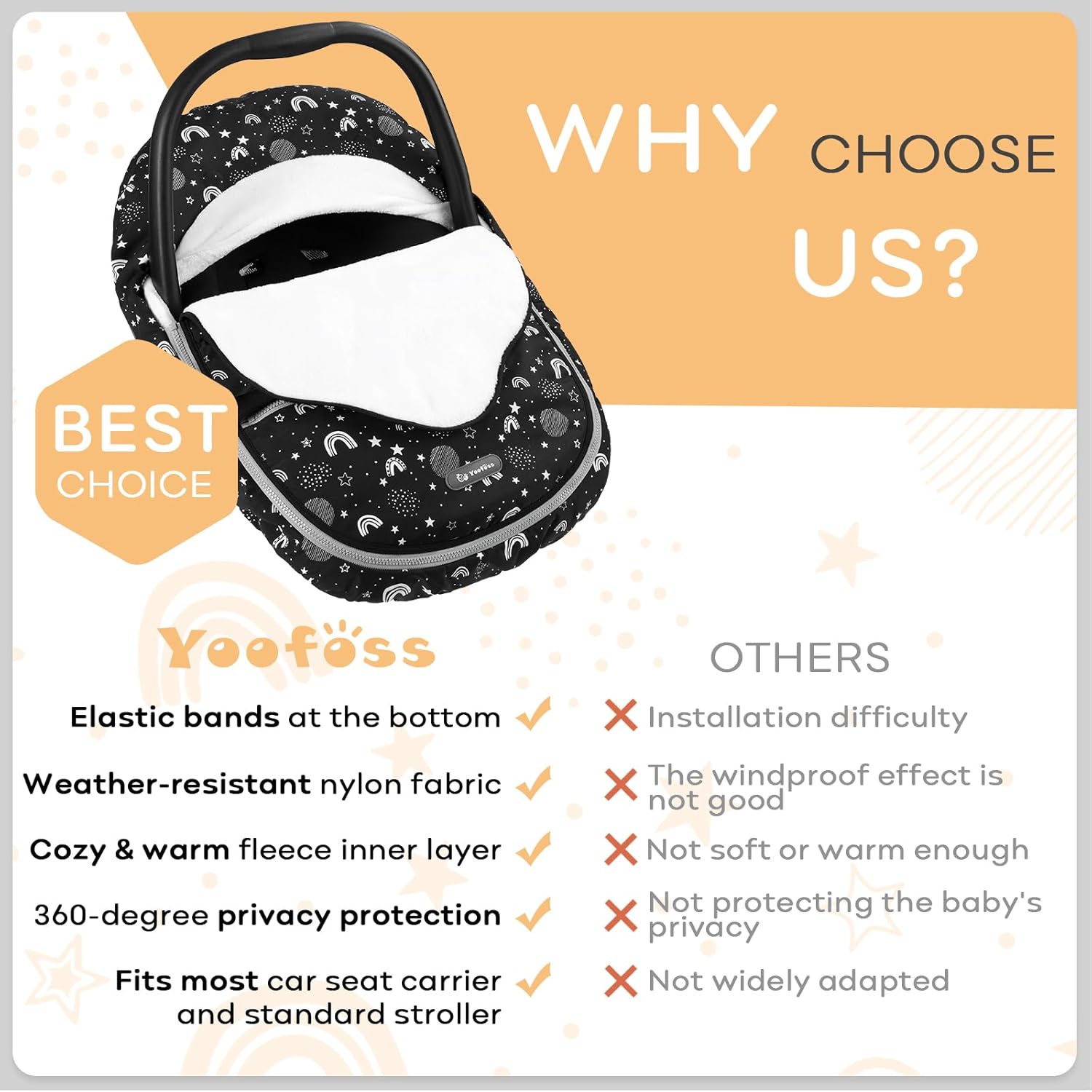 - Winter Car Seat Cover for Babies: Weather-resistant nylon blocks wind and rain. Soft fleece cover keep out the cold, way more convenient than keep a blanket on and more comfortable than using a coat or snowsuit.
