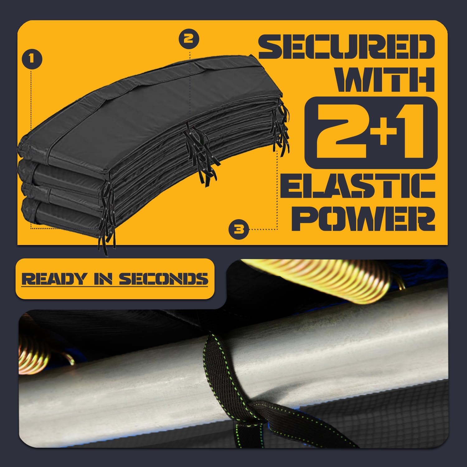 - 👨👩👧👧【270° All-Around Safety Protection】👨👩👧👧At ULTRAPOWER SPORTS, your child's safety comes first! Our trampoline pad replacement is designed to shield kids from exposed springs, preventing injuries while they jump. The extended 270° protective cover wraps around the trampoline frame, offering inside-out protection. Built for durability, it features a 0.55mm thick PVC surface + 0.6-inch protective cotton + an ultra-dense PE bottom, ensuring maximum safety, comfort and fun.