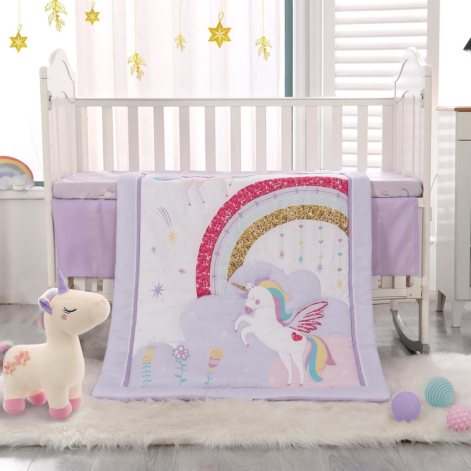 - Theme: Purple baby mini crib sets for girls features adorable unicorns, whimsical rainbows, and cascading stars. It create a dreamy bedroom, bringing more color and warmth to life. You will find your baby getting a restful sleep