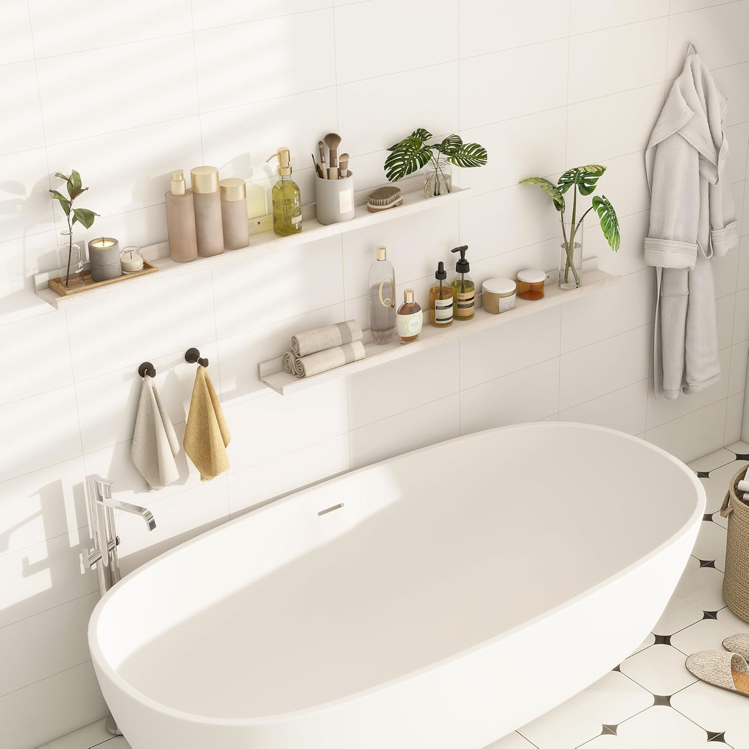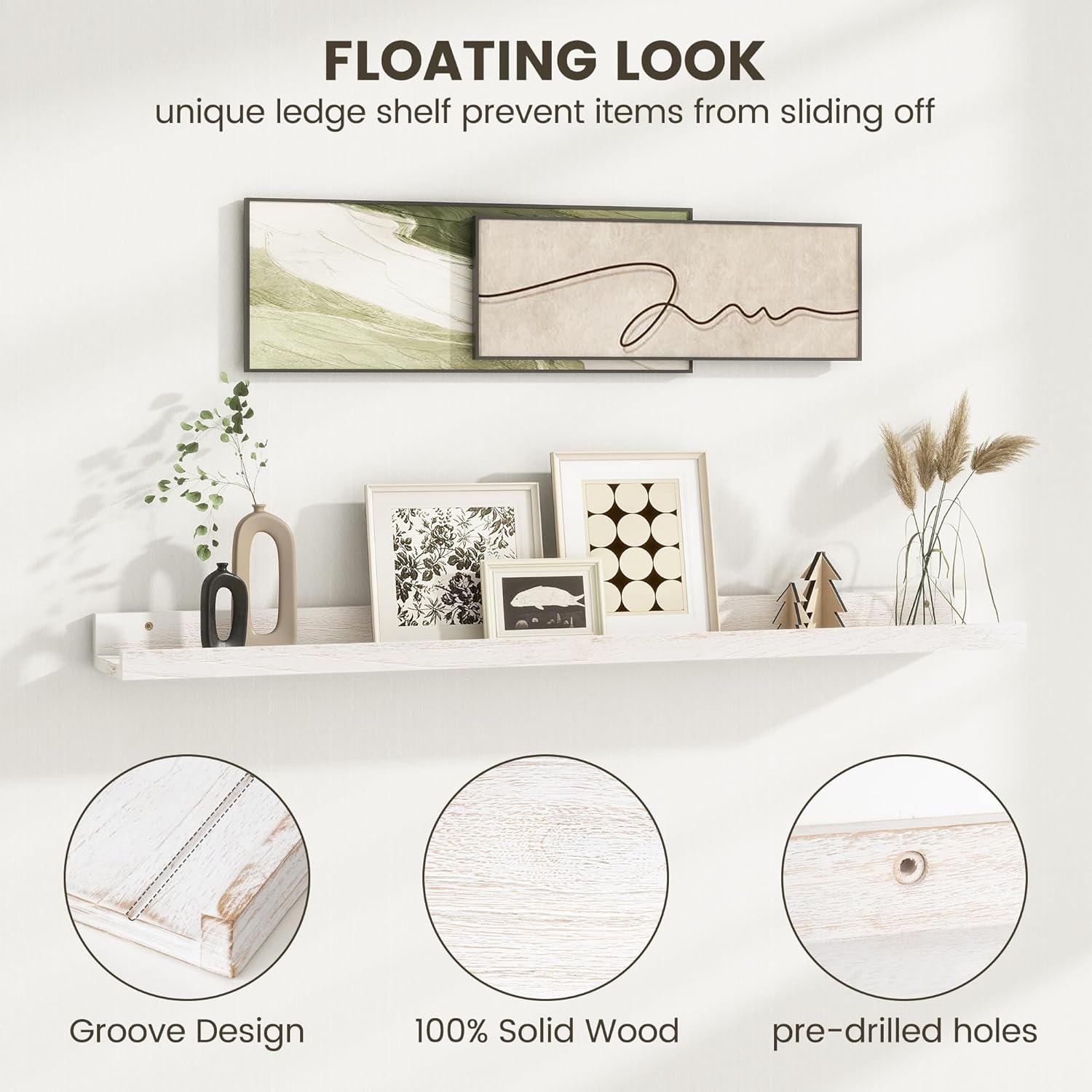 Picture Ledge Shelf, 48 Inch Long Floating Shelves for Wall, Nursery Bookshelf for Storage with Lip, Rustic Elm Wood Photo Ledge Shelves for Bedroom, Living Room, Kitchen (White, 48in Set of 2)