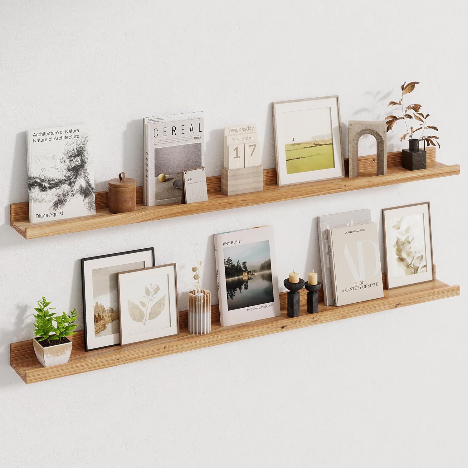 Picture Ledge Shelf, 48 Inch Long Floating Shelves for Wall, Nursery Bookshelf for Storage with Lip, Rustic Elm Wood Photo Ledge Shelves for Bedroom, Living Room, Kitchen (Natural, 48in Set of 2)