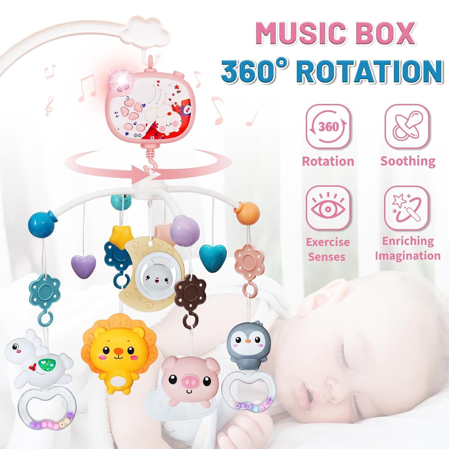 - 【Baby Crib Toys】: Baby Mobile includes a music box with adjustable volume and soft lighting that plays lullabies. With the soft music, the animal rattles slowly rotate to accompany and soothe your baby to a sweet sleep.