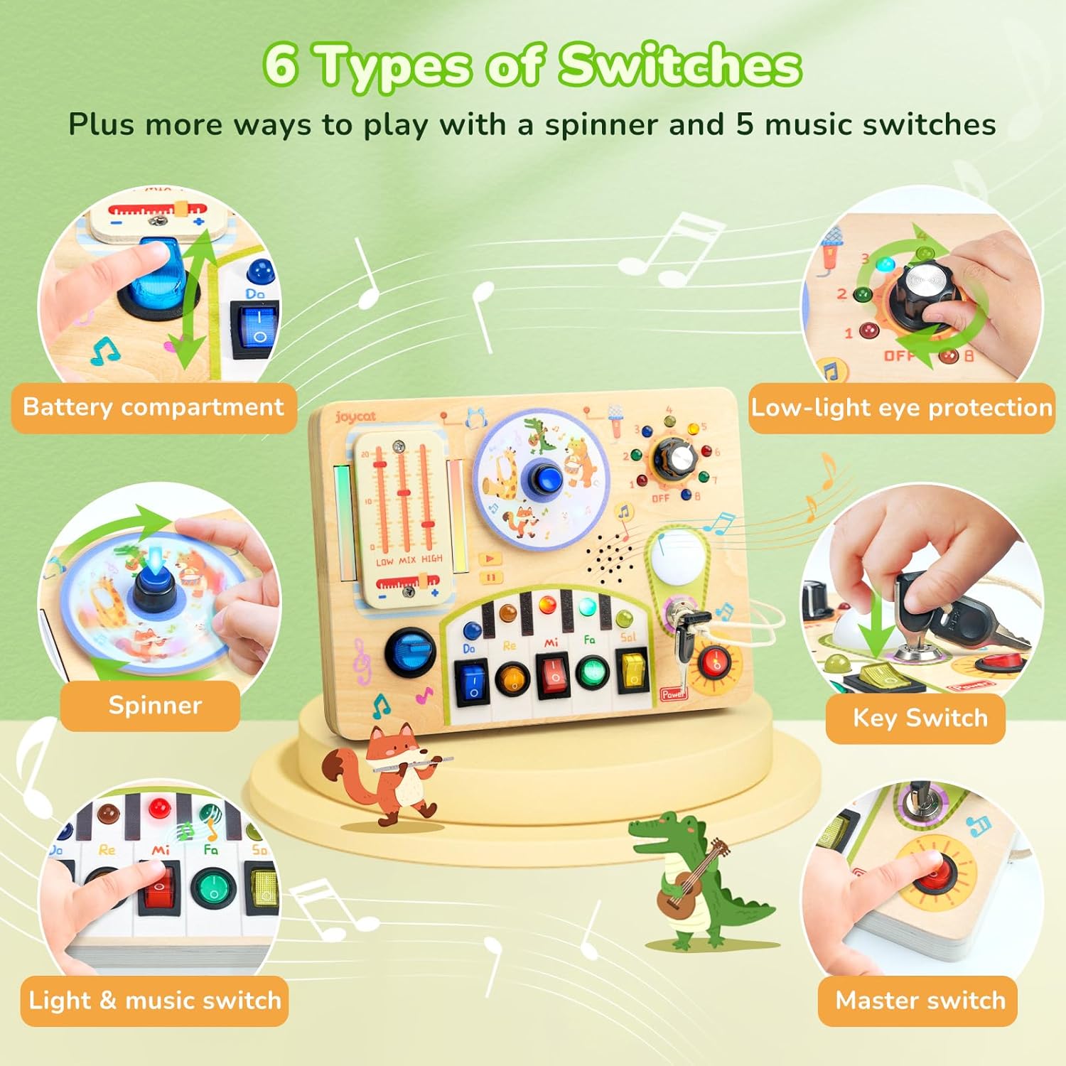 - Interactive Wooden Switch Board: Designed for toddlers who love switches and LED lights, this toddler busy board features different switches, each linked to a unique LED. The brightness is perfectly adjusted to be comfortable for young eyes, not too bright or dim