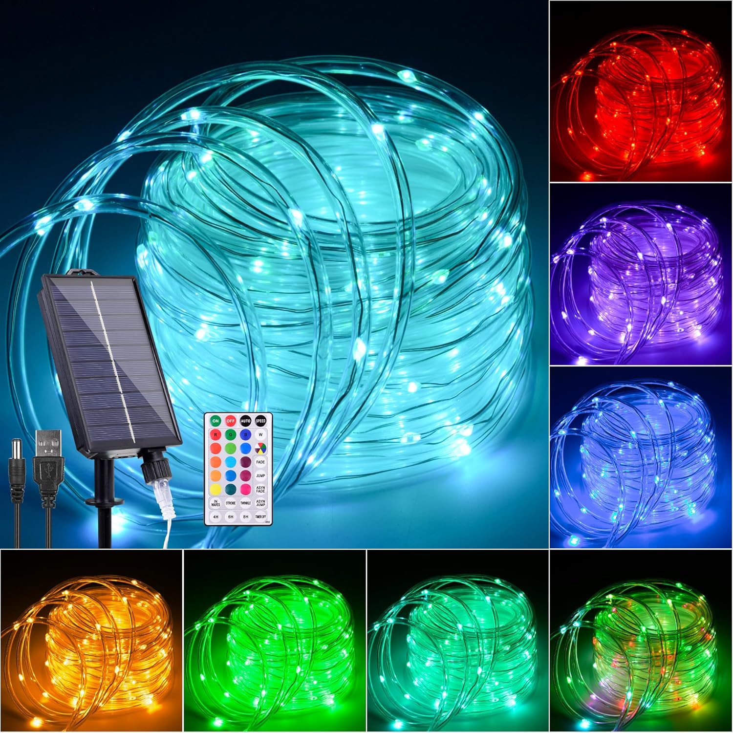 - IP68 Waterproof & Sturdy: Our rope lights for outside solar powered are made of sturdy copper wire and wrapped by a transparent tube, The solar color changing rope lights and solar panel have an IP68 waterproof rating, which ensures their durability against any weather conditions, such as rainstorms, blizzards, or daily heat. Note: Please close the lid of the charging port tightly when not USB charging