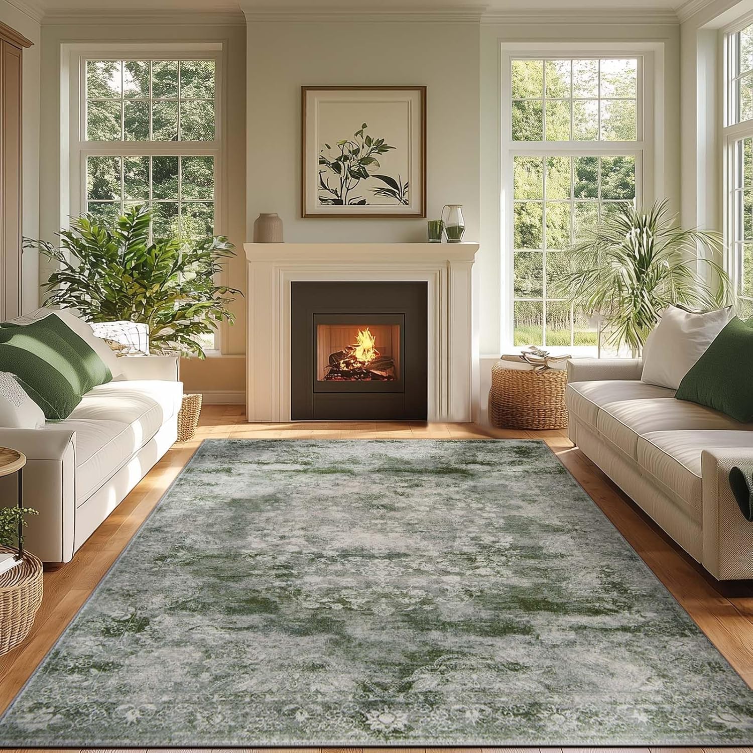 jinchan Washable Area Rug 6x9 for Living Room - Soft Faux Wool Ultra-Thin Stain Resistant Non-Slip Distressed Vintage Floral Rug Large Carpet for Bedroom,Dining Room,Home Office,Nursery(Green, 6'x9')